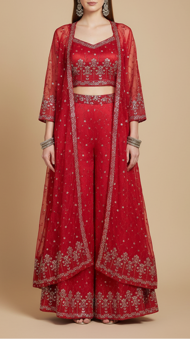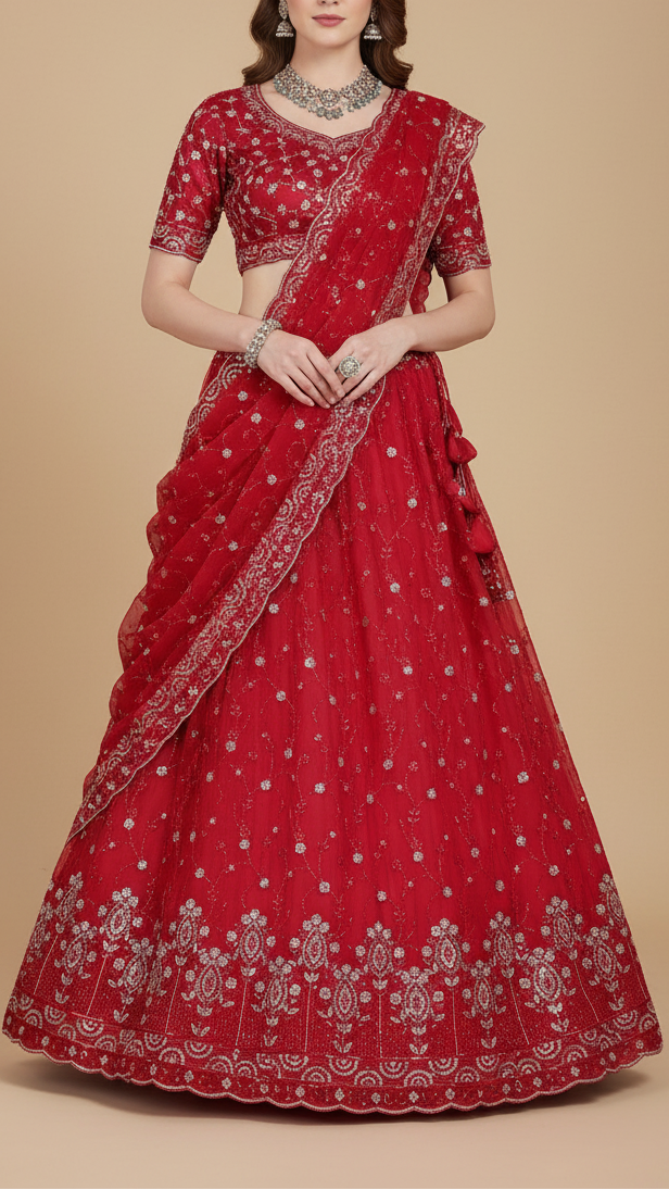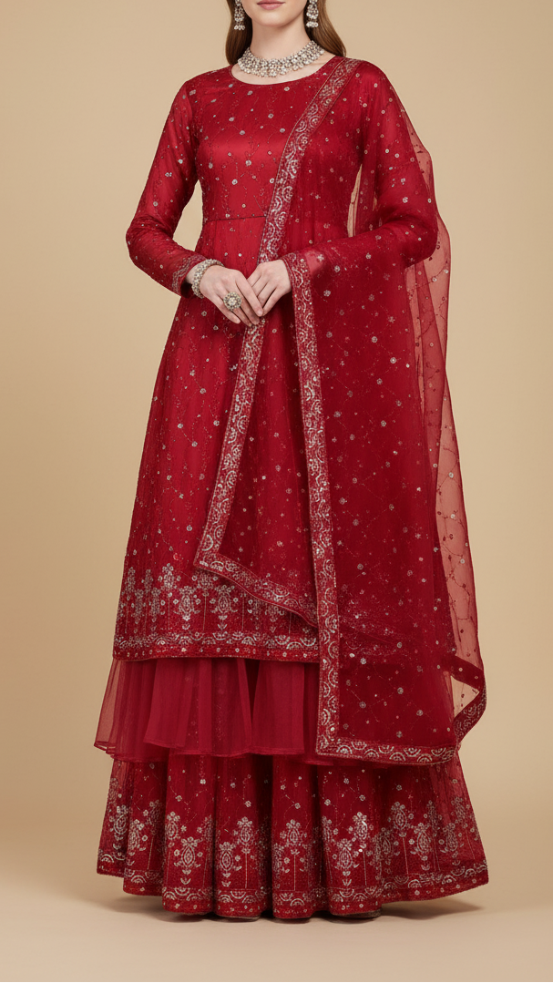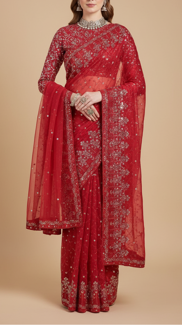 | Fabric Name | Red Organza Satin Fabric With All Over Sequins And Bead Work With One Side Scalloped Border |