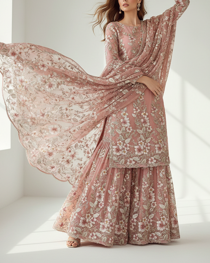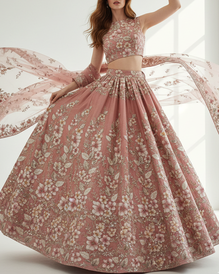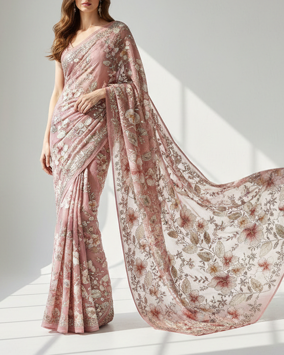 | Fabric Name | Rosy Brown Imported Net Fabric With All Over Sequins, Bead, Katdana And Ribbon Work |