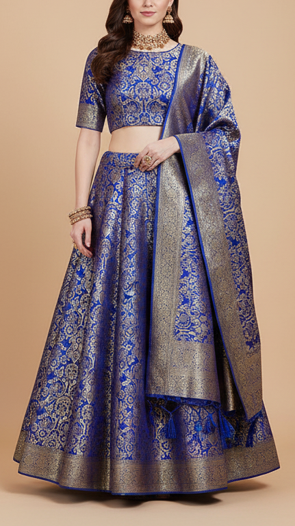 | Fabric Name | Royal Blue Banarasi Brocade Fabric With All Over Golden Zari Handloom |