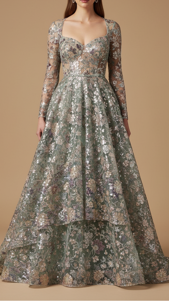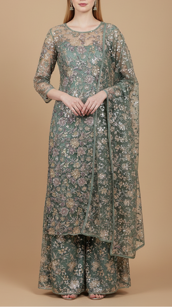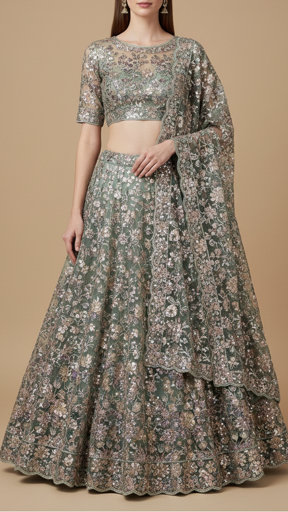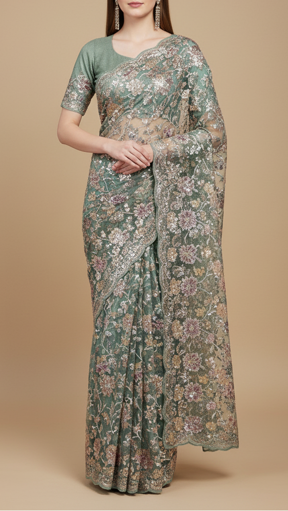 | Fabric Name | Sea Green Net Fabric With All Over Sequins And Bead Work |