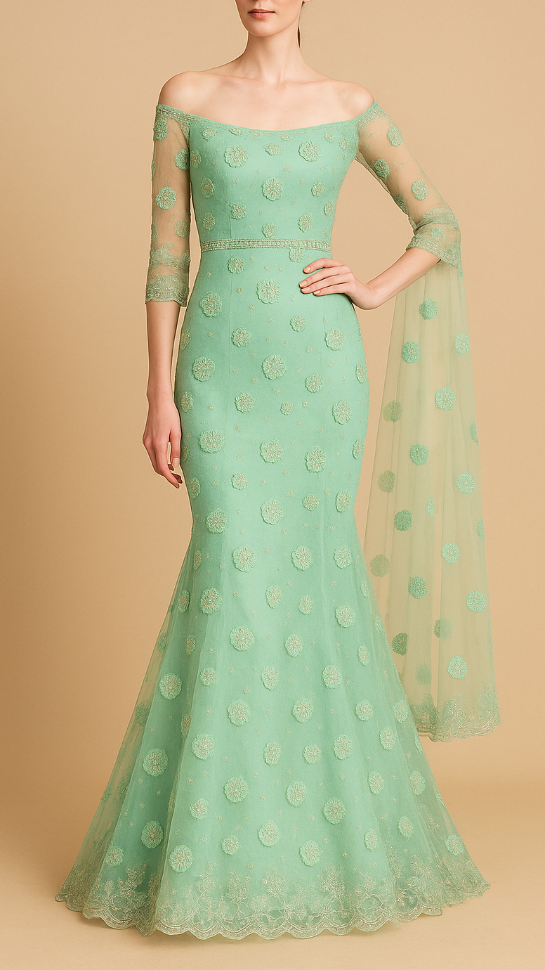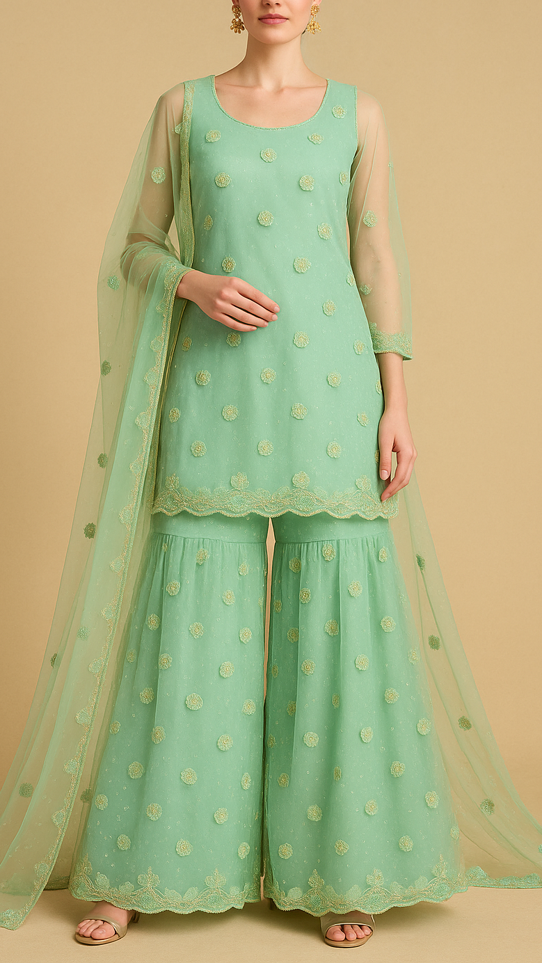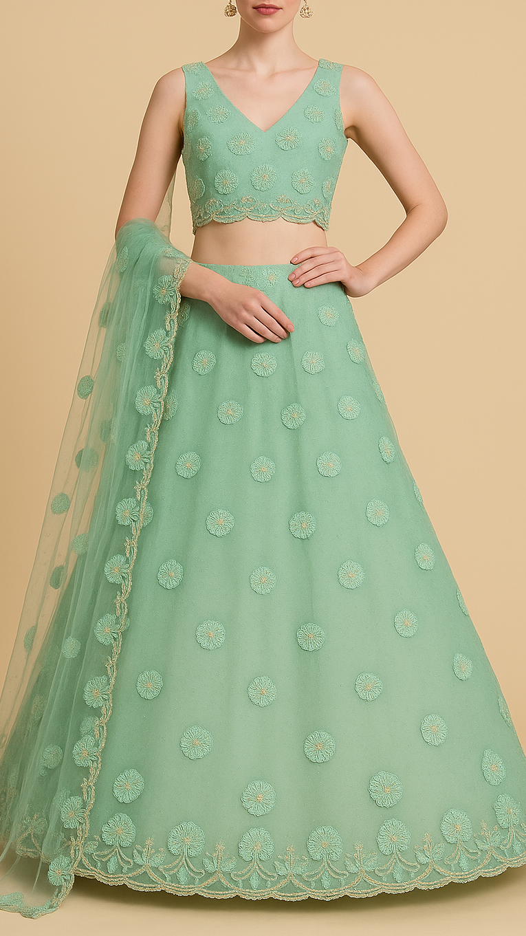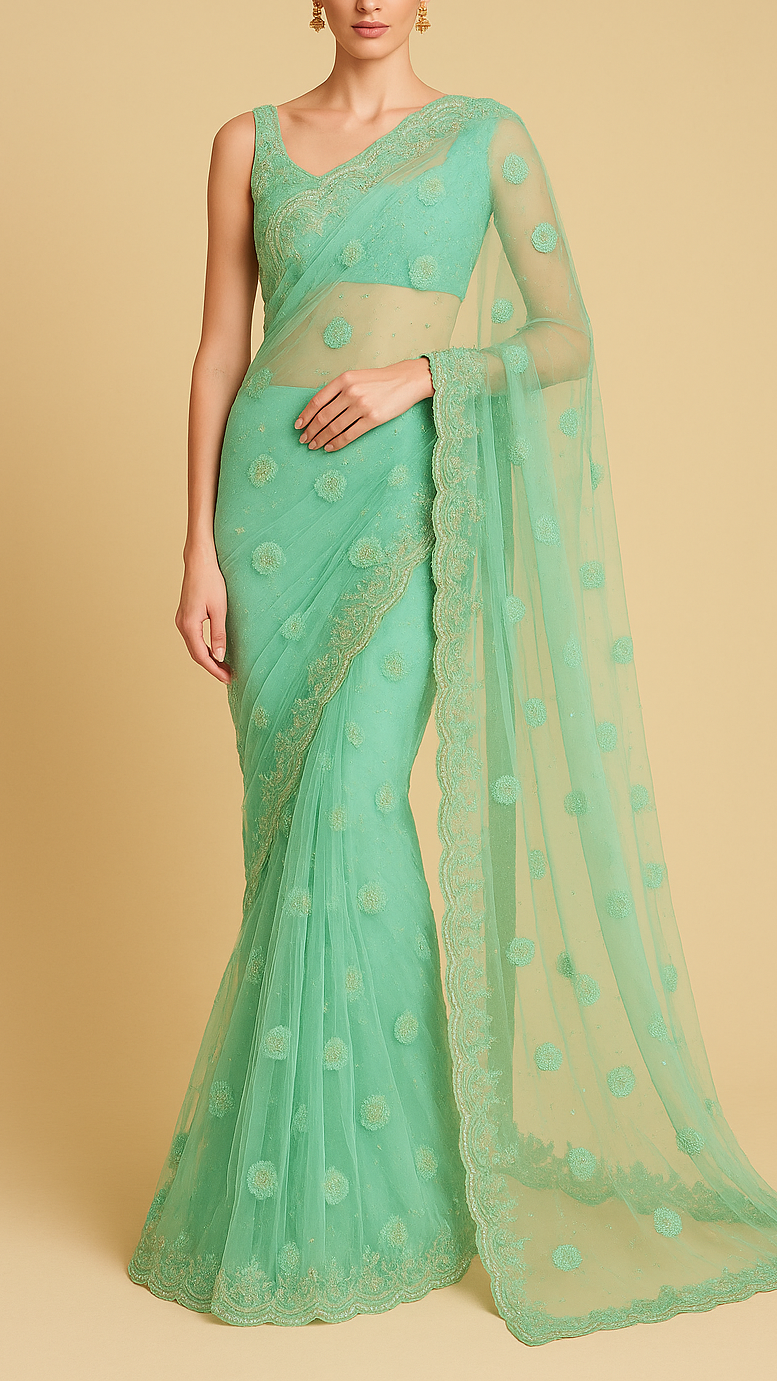 | Fabric Name | Sea Green Net Dupatta Fabric With All Over Ribbon Work, Bead And Sequins Work With Two Side Border |