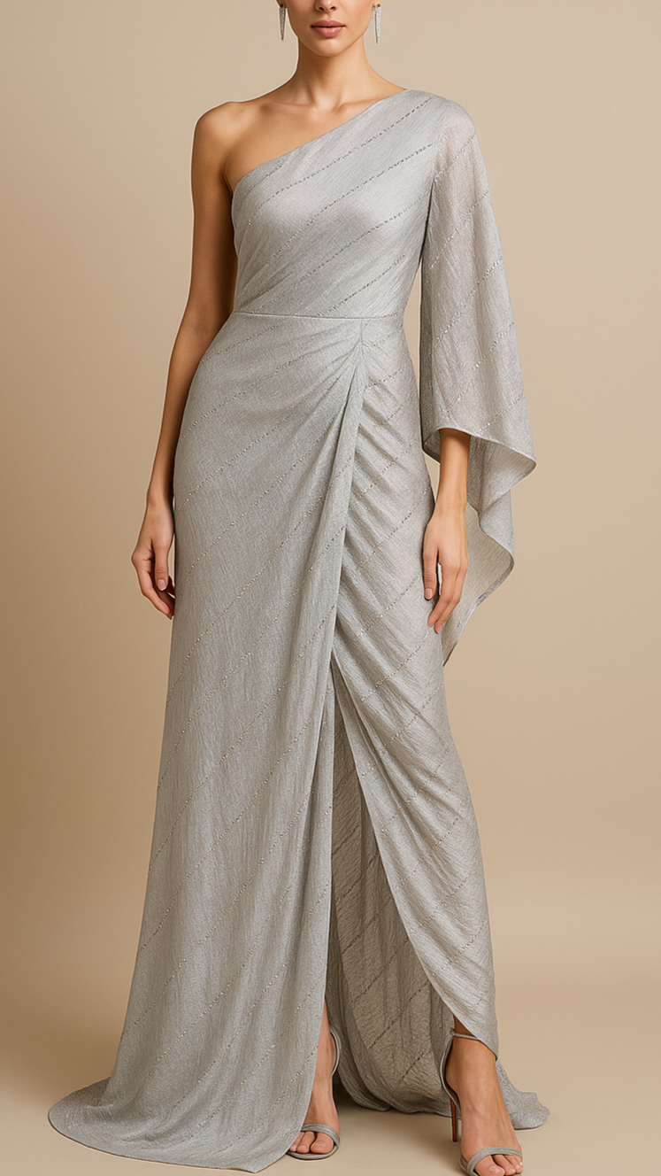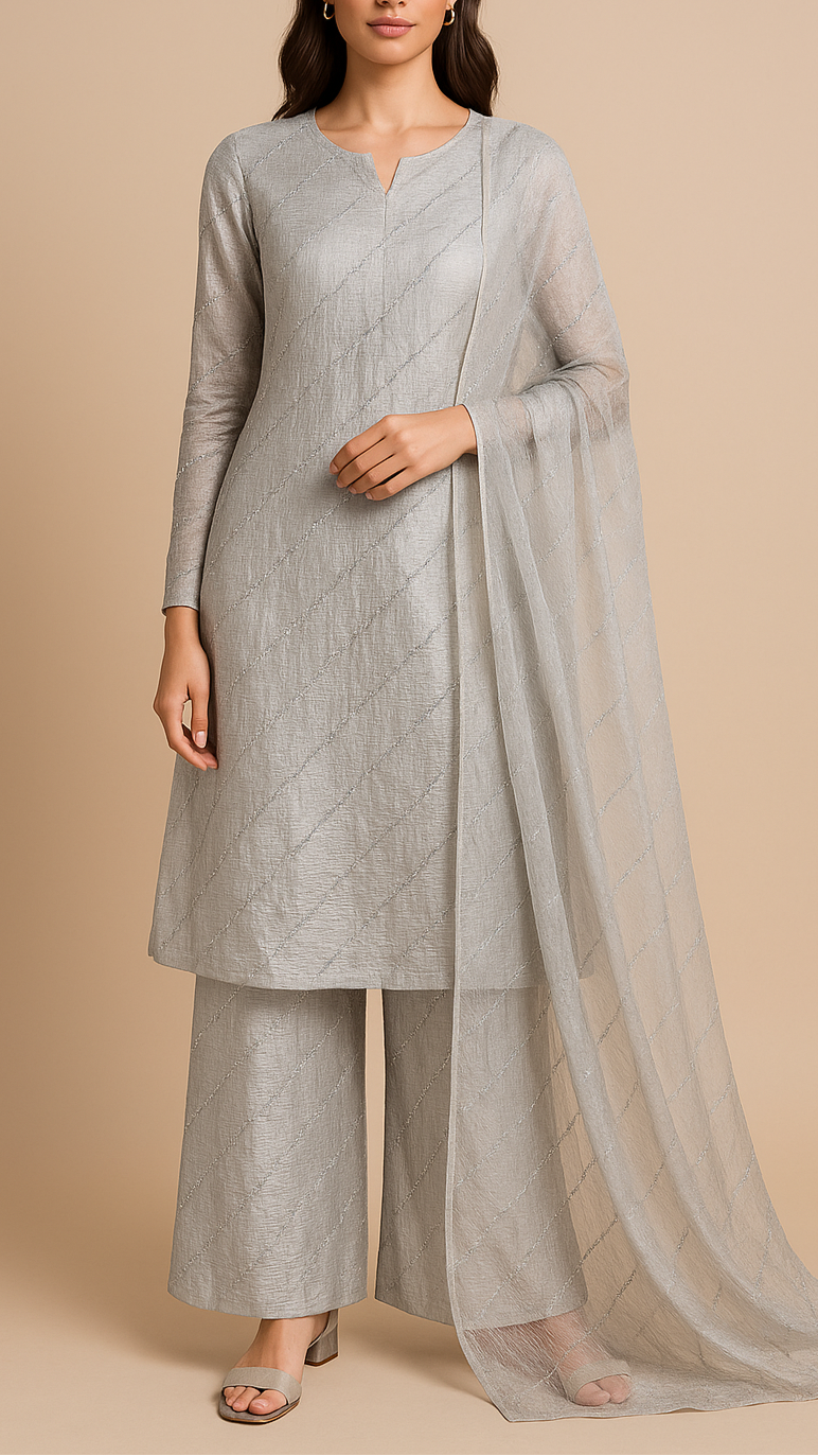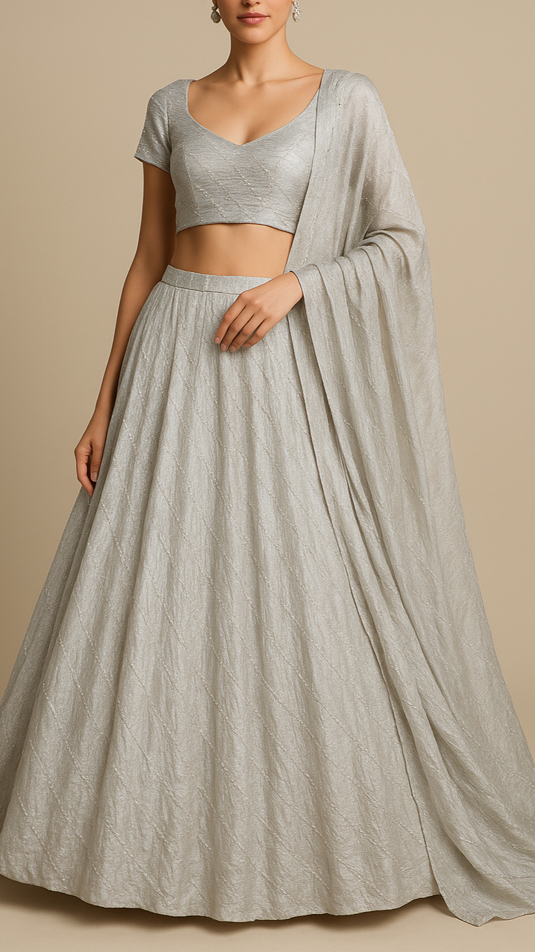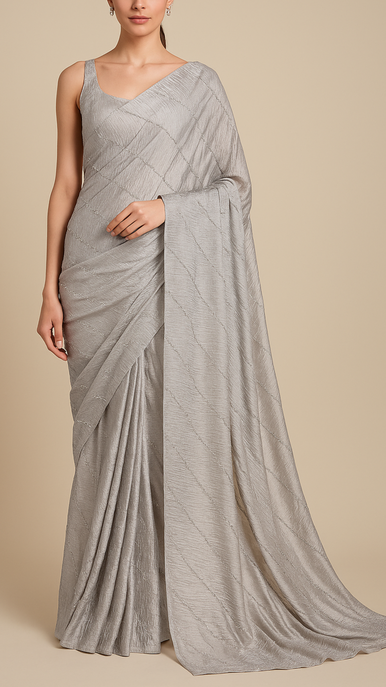 | Fabric Name | Silver Crushed Tissue Fabric With All Over Diagonal Stripes Of Katdana, Bead And Sequins Work |