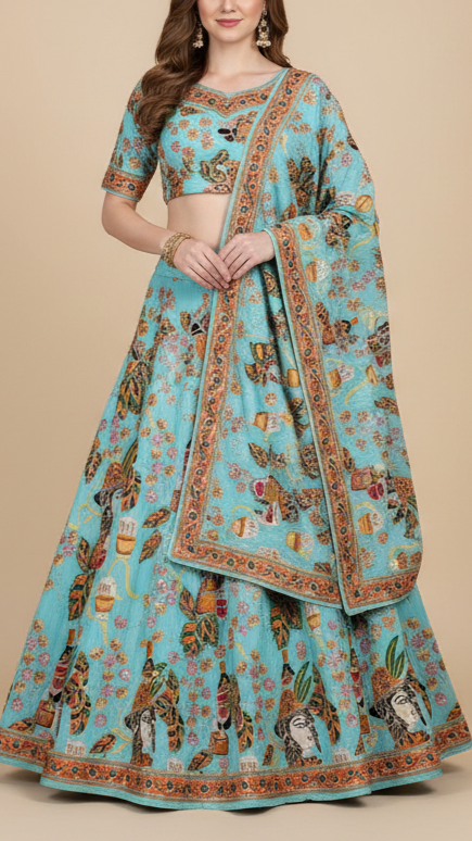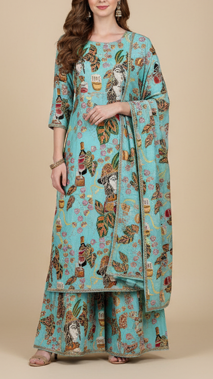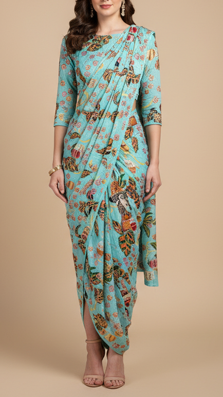 | Fabric Name | Sky Blue Crepe Fabric with All Over Zari and Sequins Work with Abstract Print |