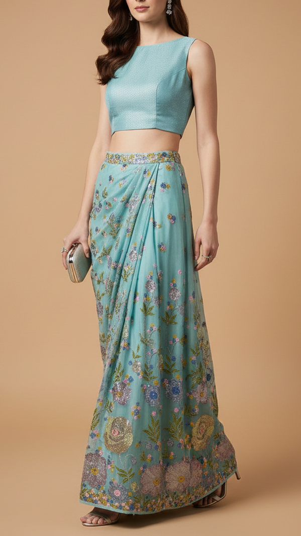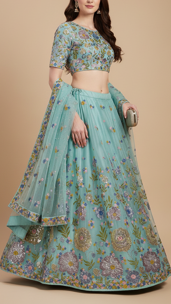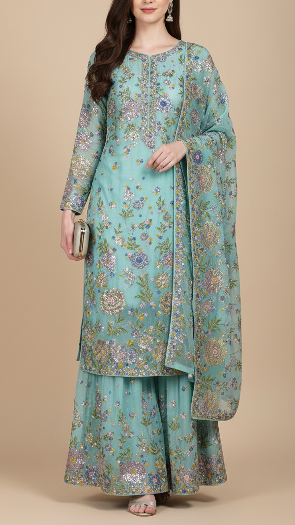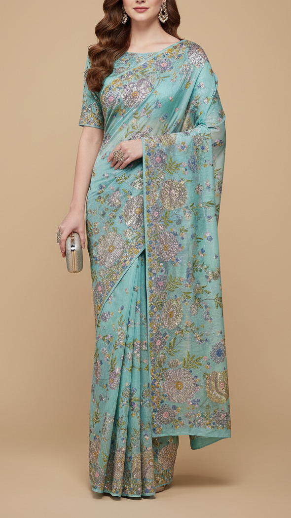 | Fabric Name | Sky Blue Georgette Fabric With All Over Thread, Zari And Sequins With One Side Border |