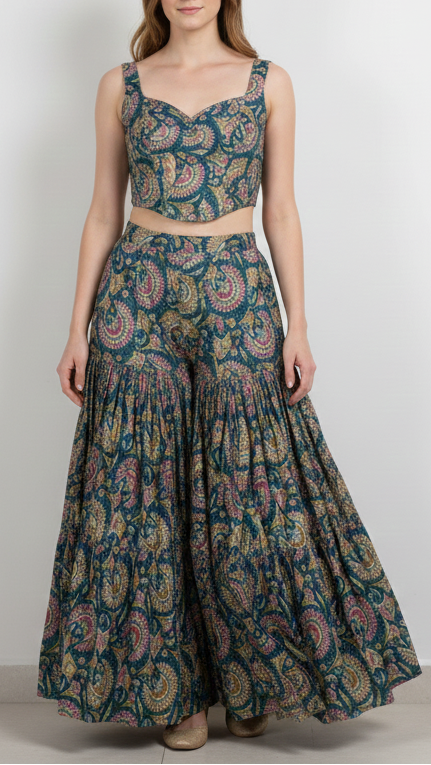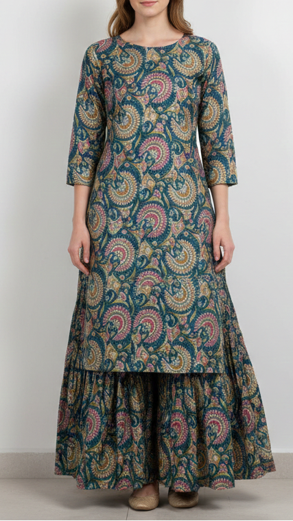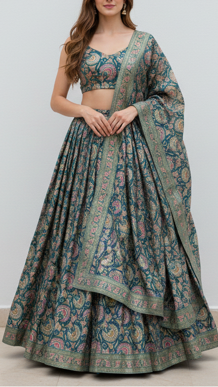 | Fabric Name | Teal Blue Silk Fabric With Traditional Print With Golden Zari Work |