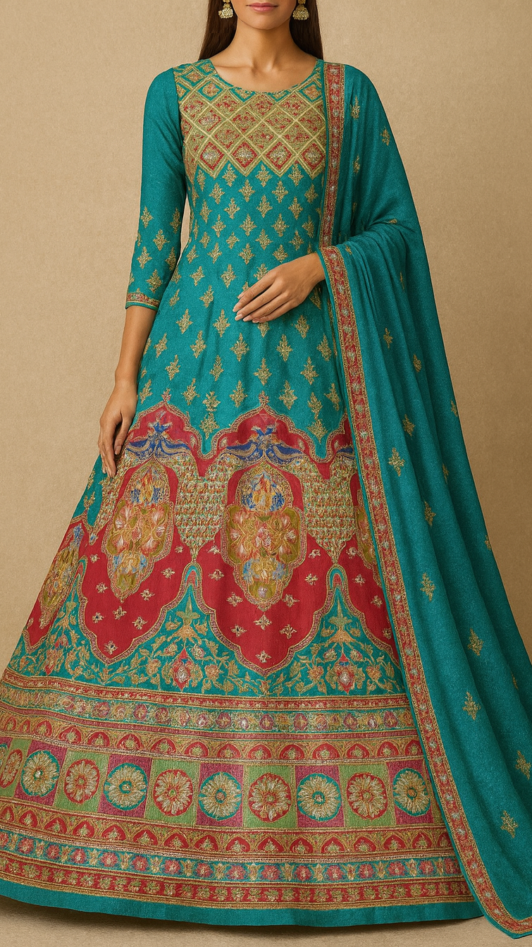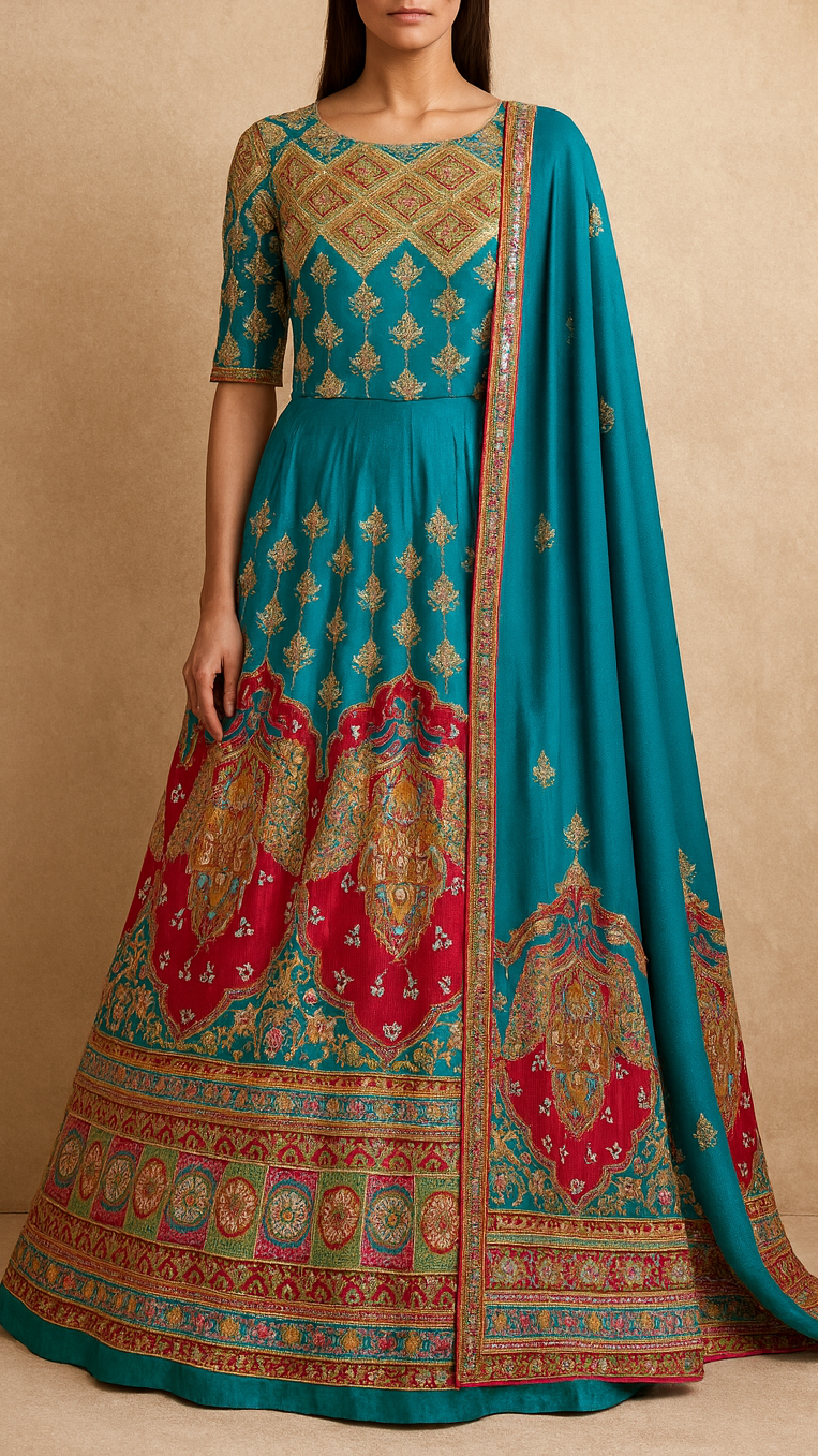 Ideal for sarees, lehengas, gowns, and dupattas, this fabric exudes richness and sophistication. The combination of zari and sequins detailing with a heavy border makes it perfect for weddings, receptions, and festive occasions.