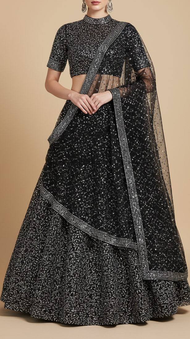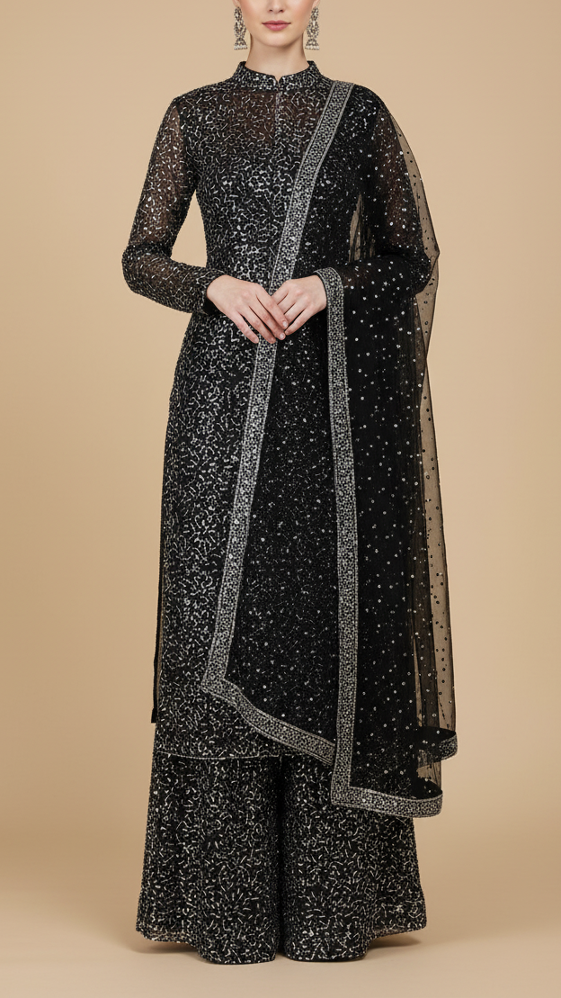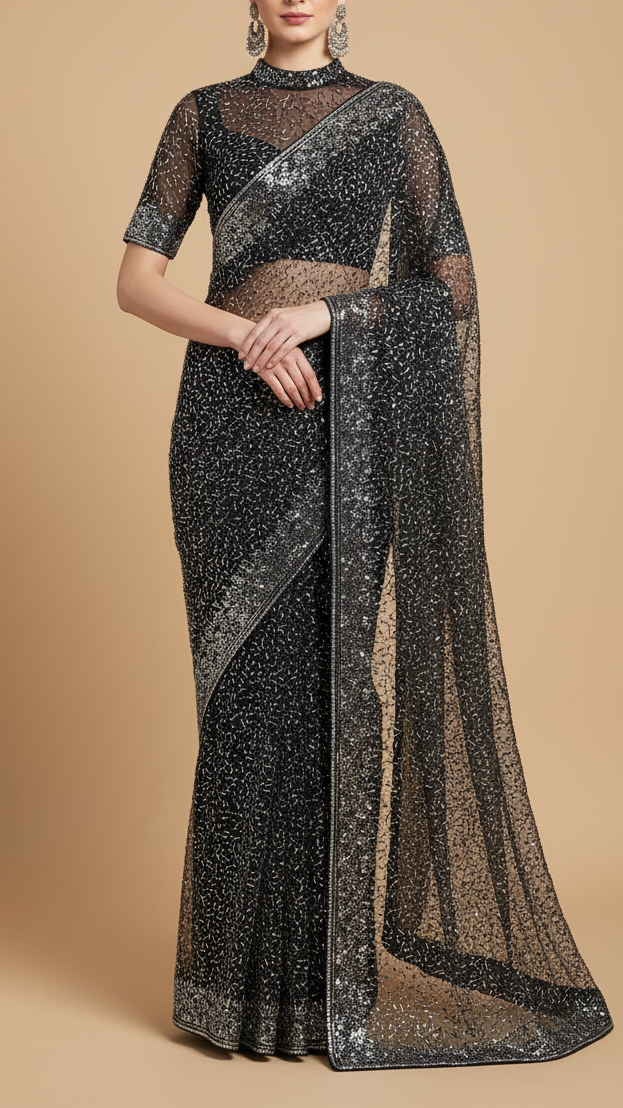 | Fabric Name | Black Net Fabric With All Over Sequins And Faux Katdana Work |