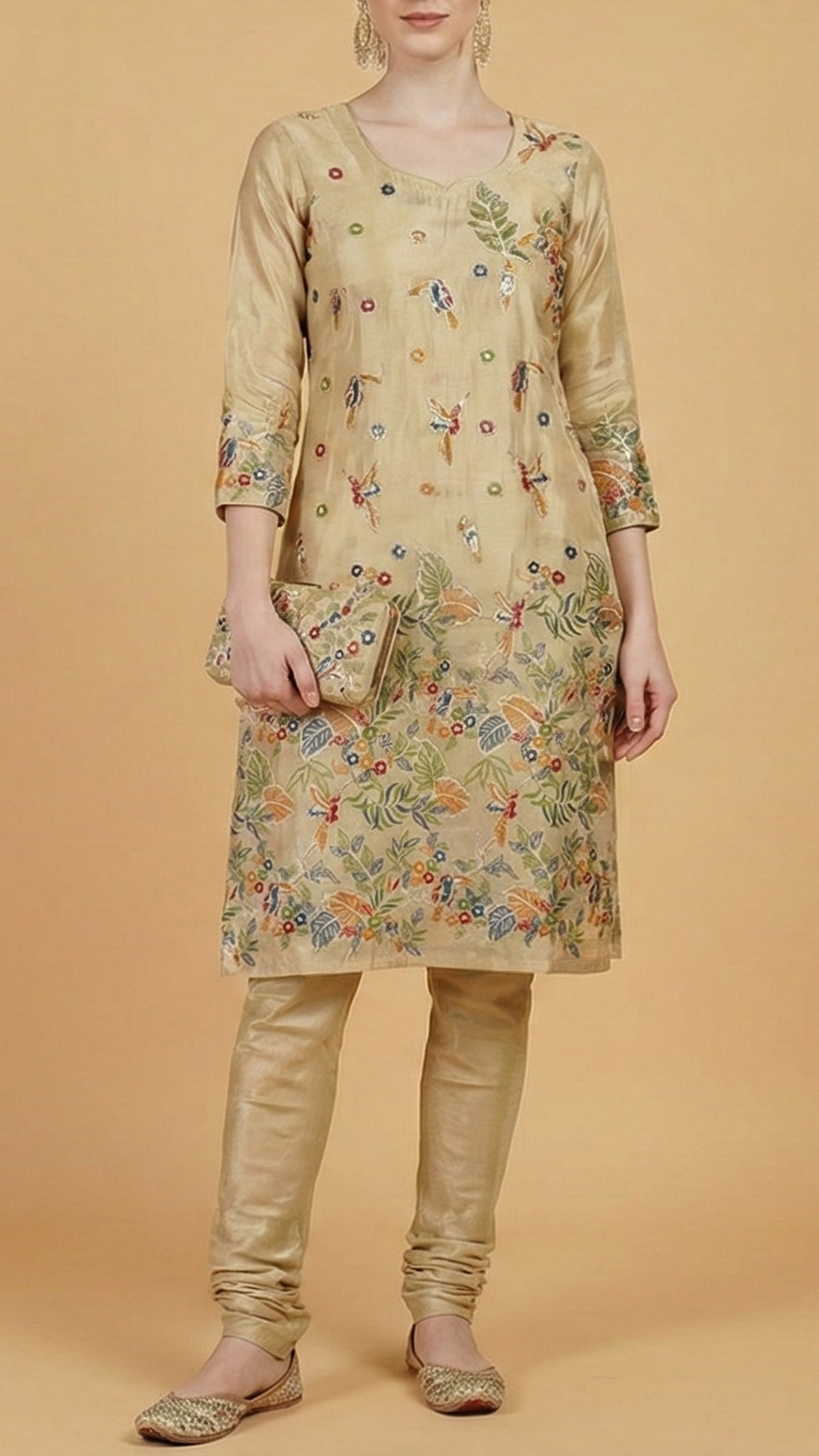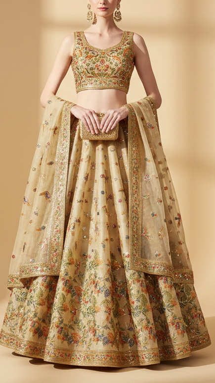 | Fabric Name | Glimmering Golden Tissue Fabric with Multicolor Thread & Zari Embroidery |