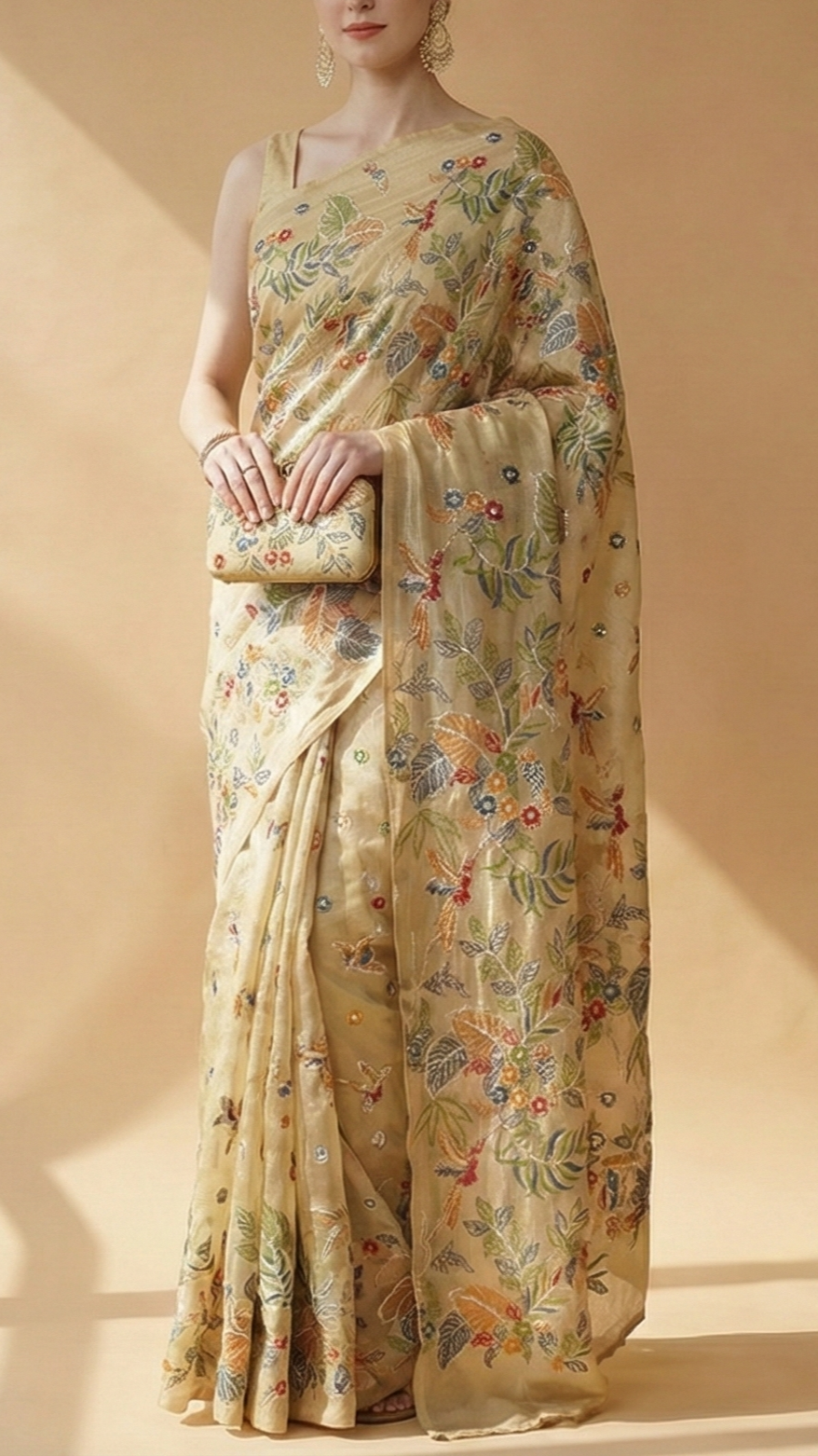 The Noor - Golden Tissue Fabric with Multicolor Thread & Zari Work | 9543