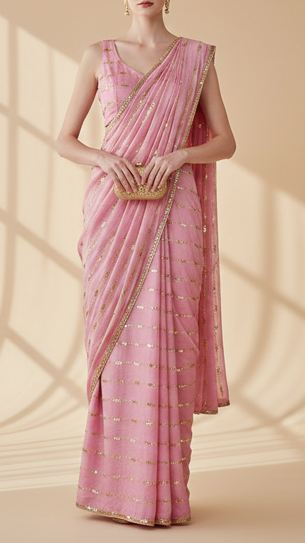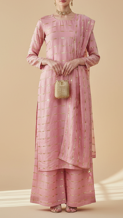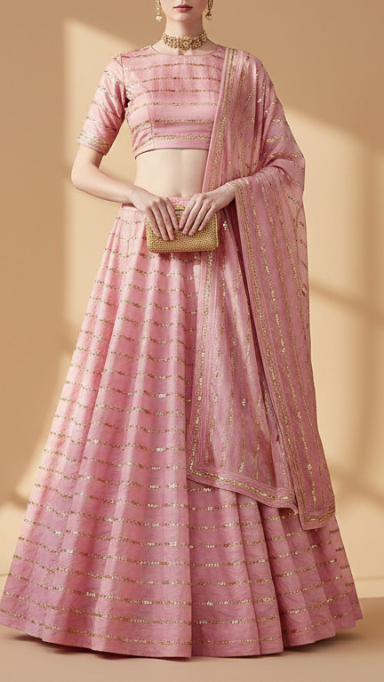 | Fabric Name | Light Pink Silk, Tissue Fabric With Allover stripes Of Katdana, Sequins And Bead Work |