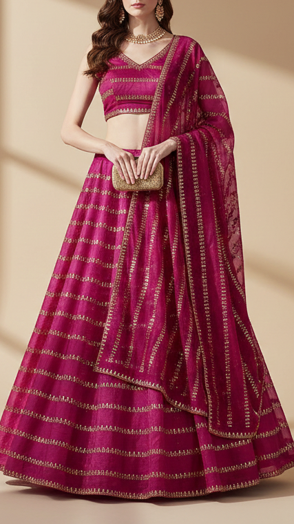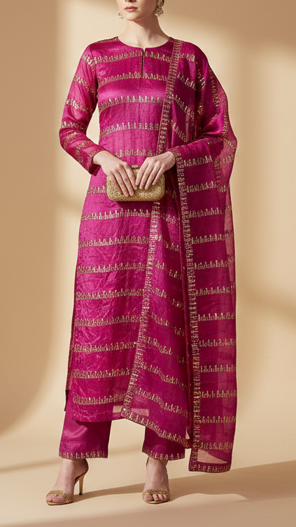 | Fabric Name | Magenta Tissue Fabric With Allover stripes Of Katdana, Sequins And Bead Work |