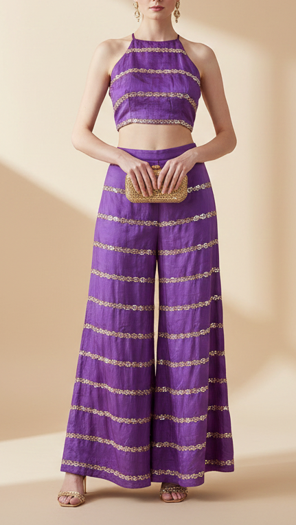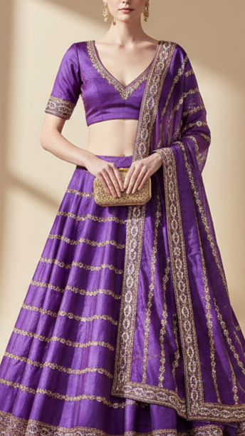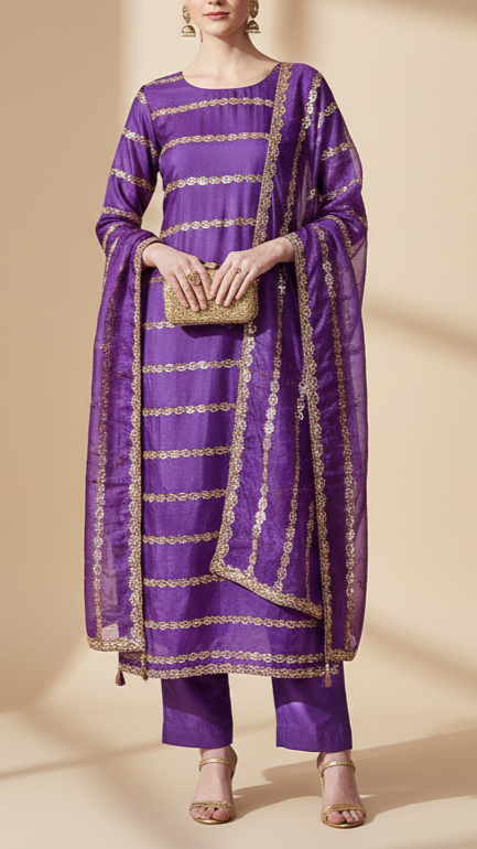 | Fabric Name | Purple Diamond Silk Tissue Fabric with All Over Pearl, Katdana, and Sequins Stripes |