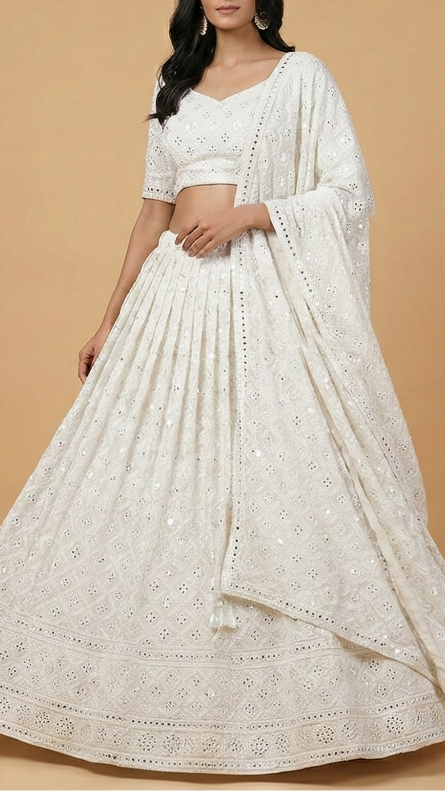 | Fabric Name | Dyeable Georgette White Fabric with Allover Thread and Faux Mirror Work 12879 |