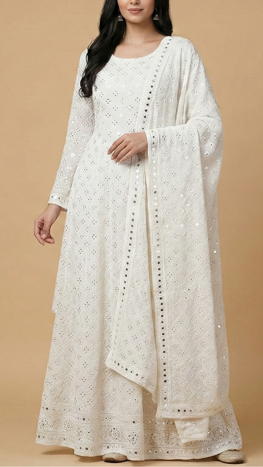 The Noor - White Georgette Fabric with Timeless Thread and Faux Mirror Work | 12879
