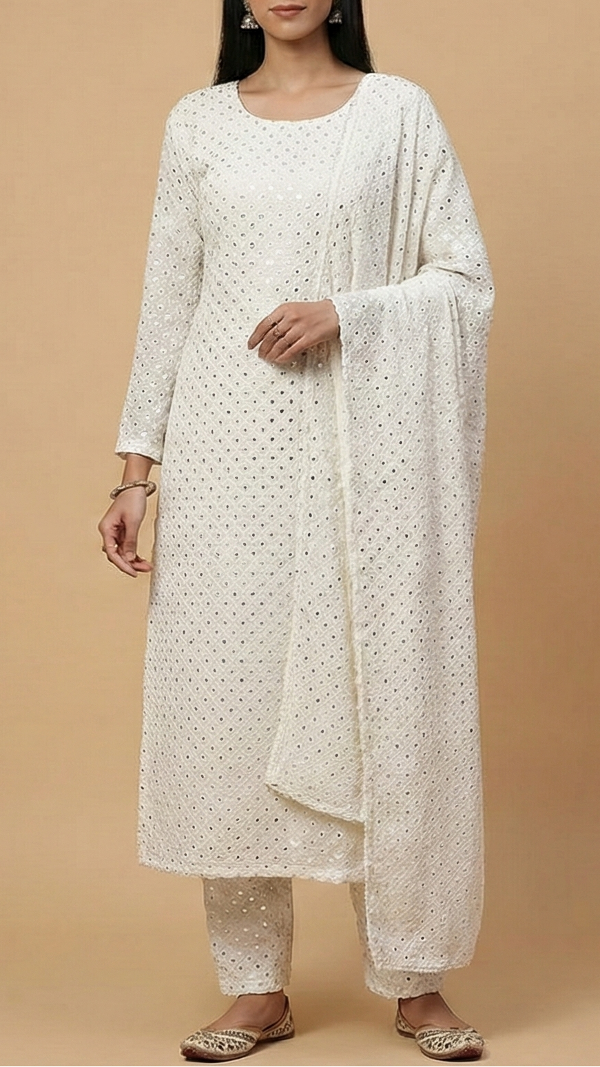 The Noor - White Georgette Fabric with Timeless Thread, Sequins, and Faux Mirror Work | 12881