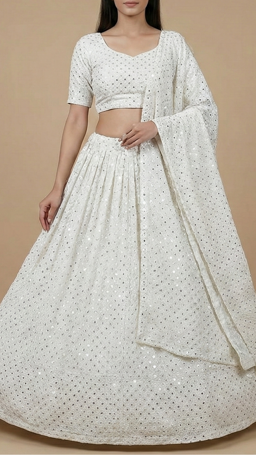| Fabric Name | Dyeable Georgette White Fabric with Allover Thread, Sequins, and Faux Mirror Work 12881 |