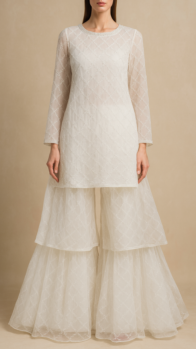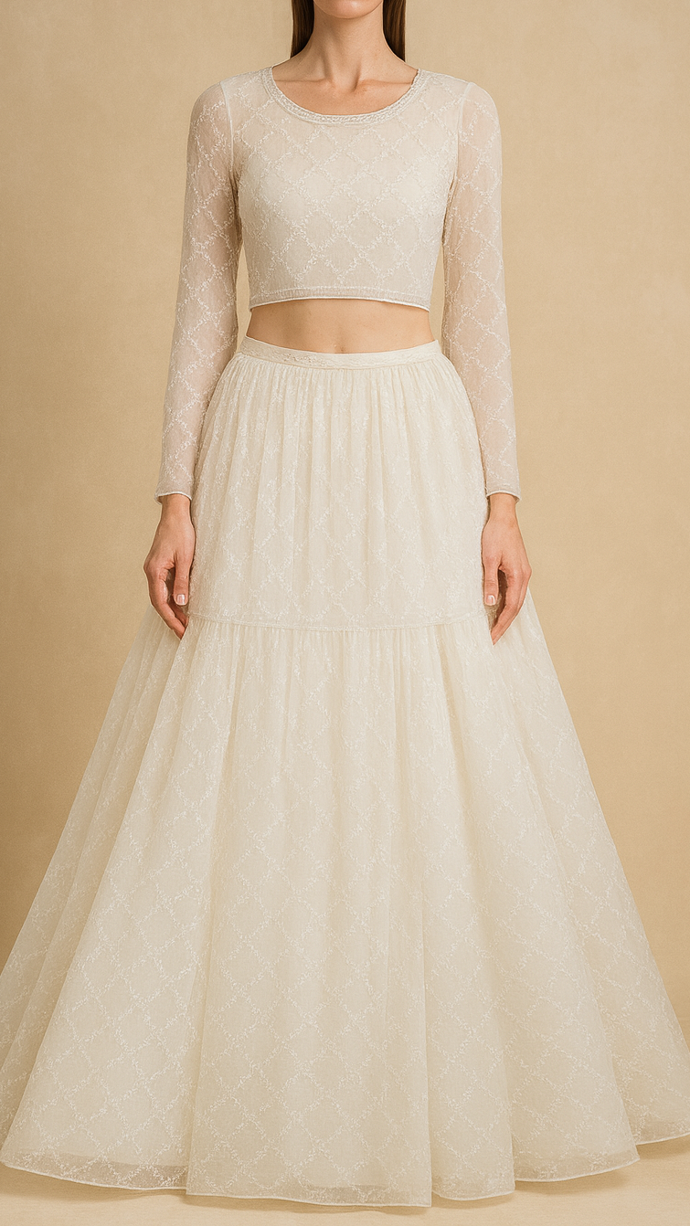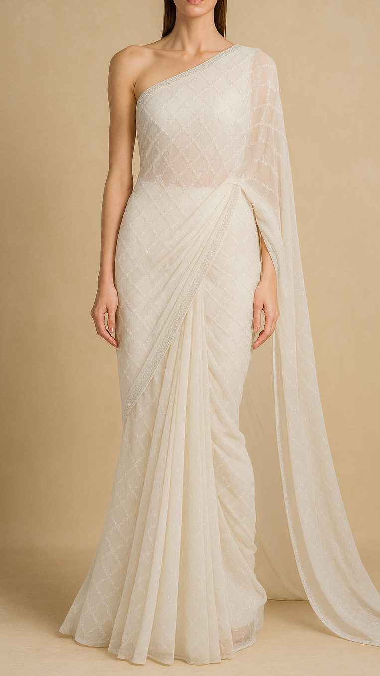 | Fabric Name | White Georgette Fabric with Allover Jaal Pattern of Sequins, Thread and Pearl Work |