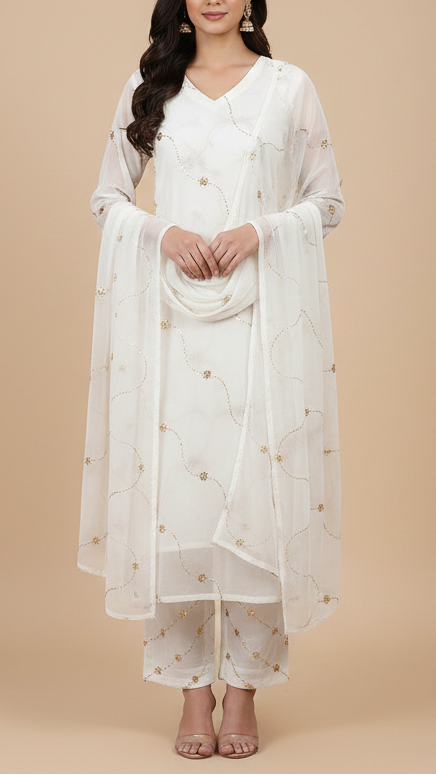 The Noor - White Georgette White Fabric with Katdana and Bead Work | 15706