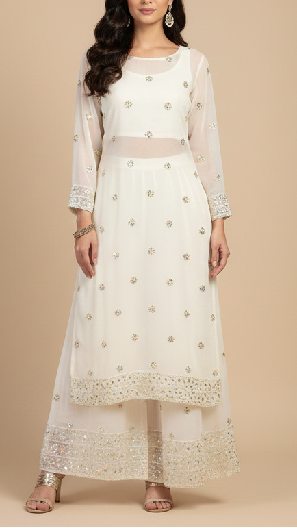 | Fabric Name | White Net Fabric with All Over Katdana and Rainbow Sequins Buti |