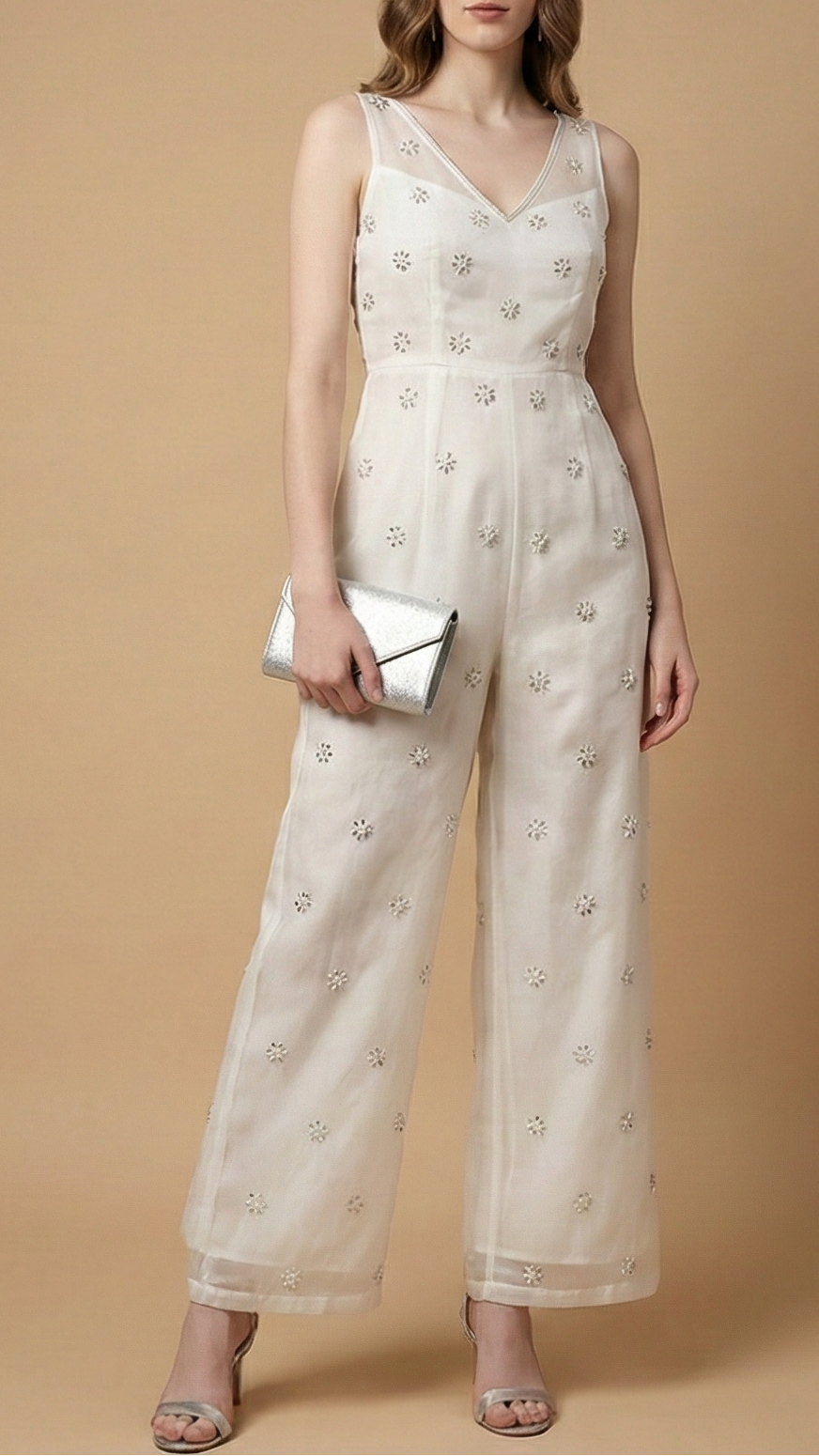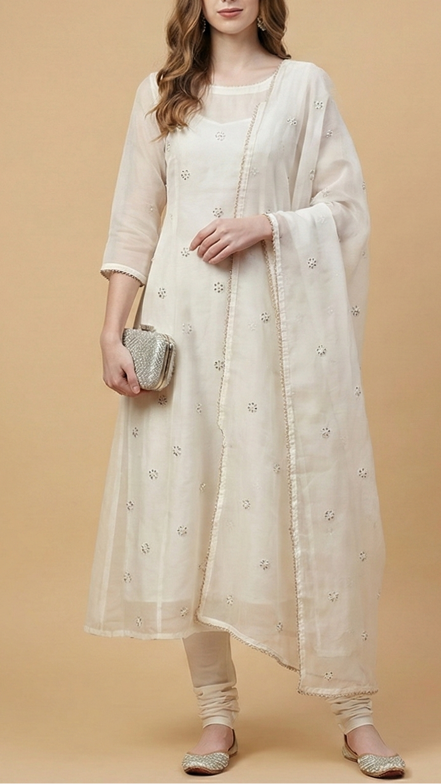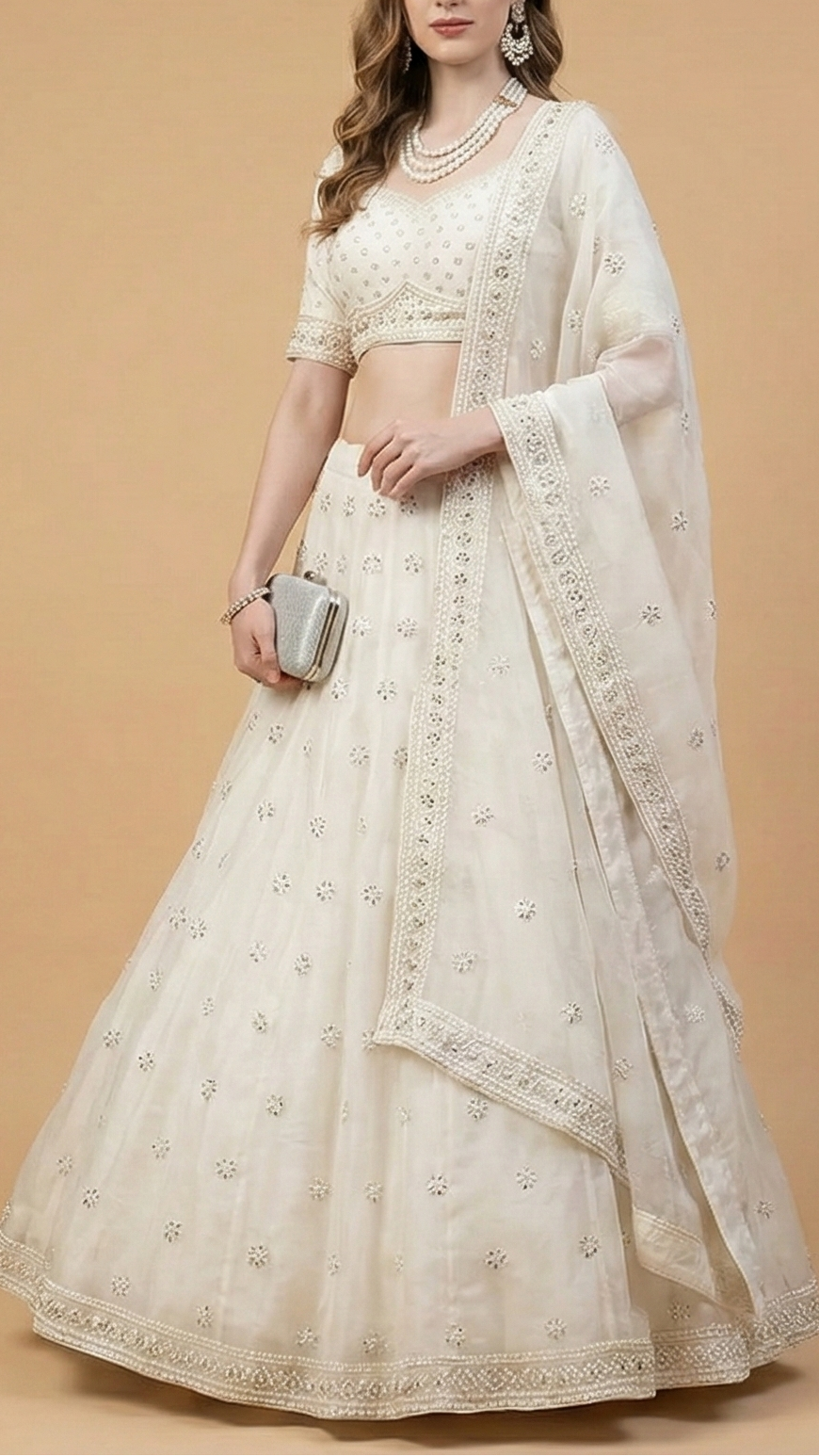 | Fabric Name | White Opulent Organza Fabric with All-Over Buti of Kutdana, Pearl, and Bead Work |