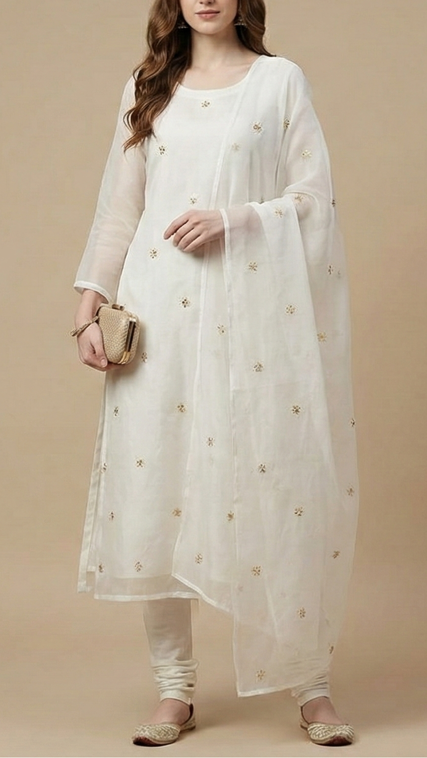 | Fabric Name | White Organza Fabric With All Over Buti Of Sequins, Katdana And Bead Work |