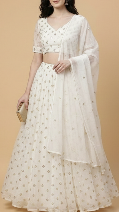 | Fabric Name | White Organza Fabric With All Over Buti Of Sequins, Katdana And Bead Work |