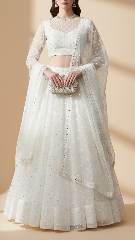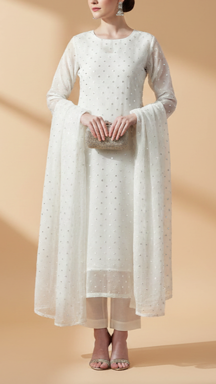 The Noor - White Organza Fabric With Thread & Faux Mirror Work | 9191