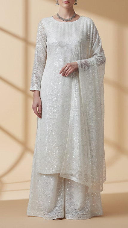 The Noor - White Upada Silk Fabric with Eternal Thread and Sequins Work | 12882