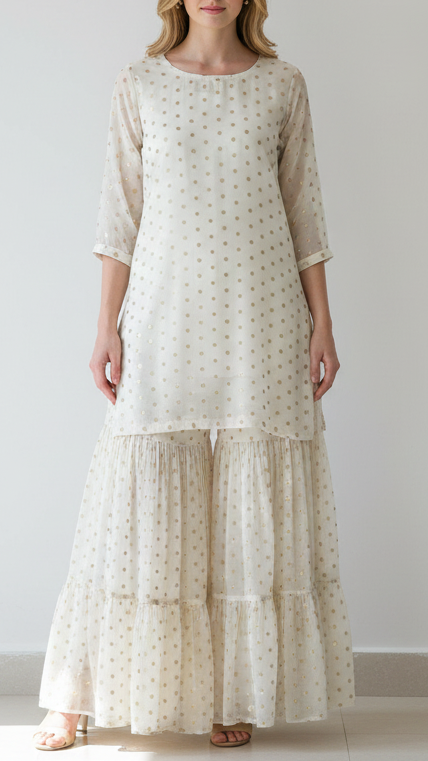 | Fabric Name | White Chinon Chiffon Fabric With All Over Golden Zari Handloom |