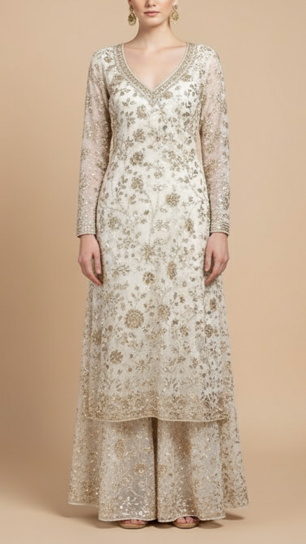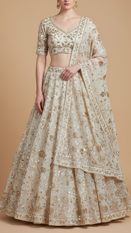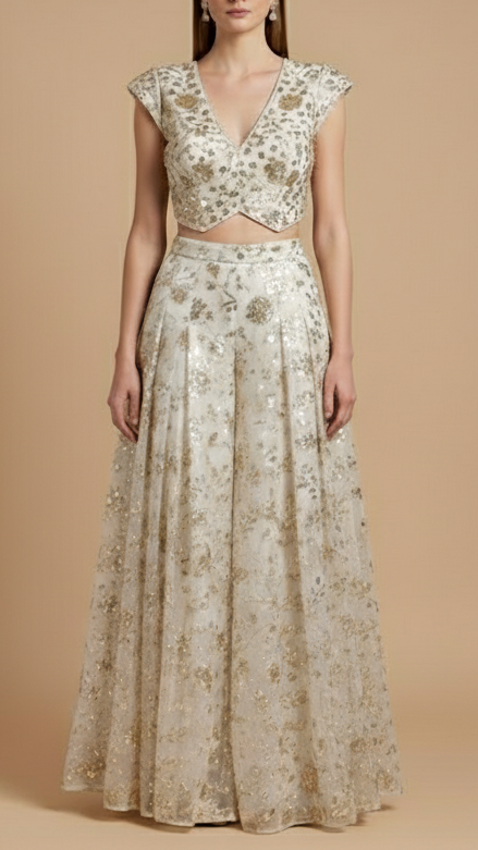 | Fabric Name | White Chinon Chiffon Fabric With All Over Katdana, Sequins And Bead Work |