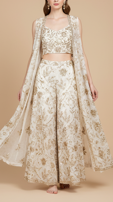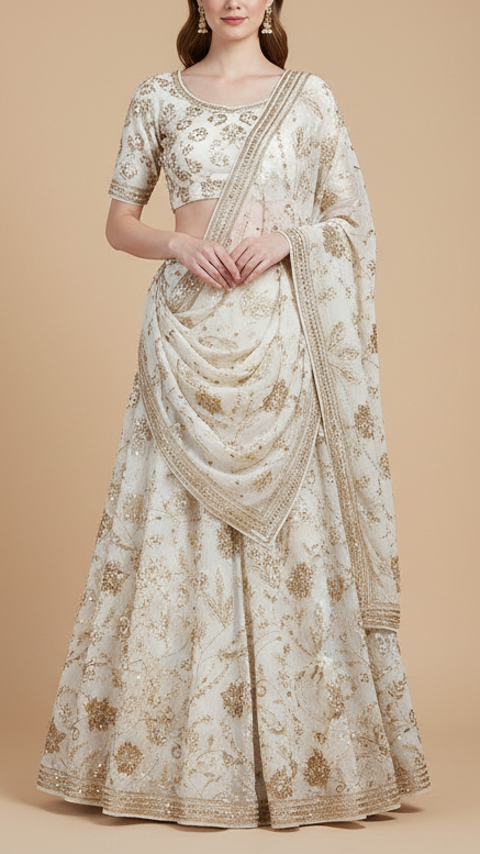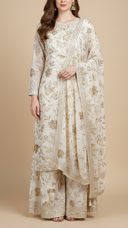 | Fabric Name | White Chinon Chiffon Fabric With All Over Katdana, Sequins And Bead Work |