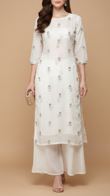 | Fabric Name | White Dyeable Chinon Chiffon Fabric With All Over Thread, Bead, Katdana And Sequins Work |