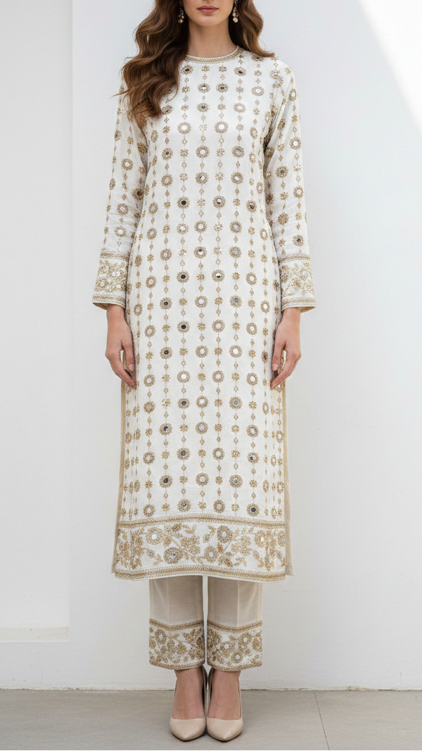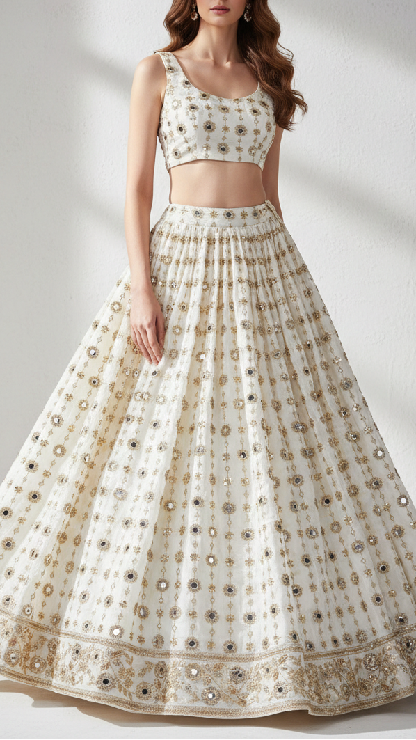 | Fabric Name | White Crepe Fabric With All Over Bead, Mirror, Katdana, Sequins, Zari Work And One Side Border |