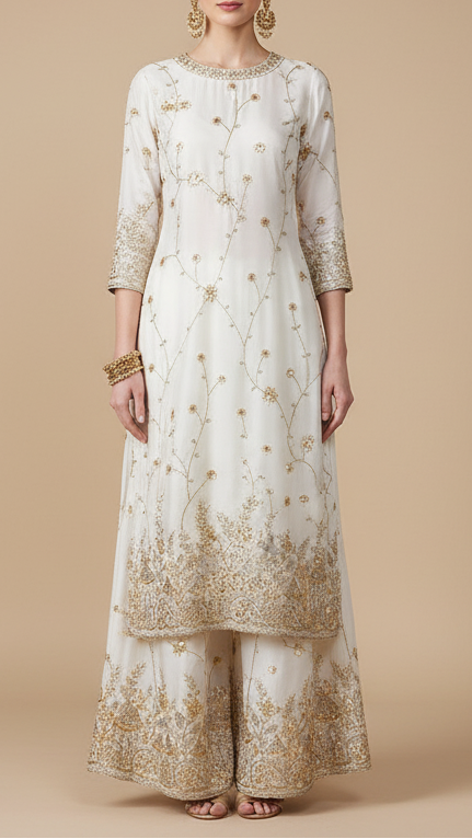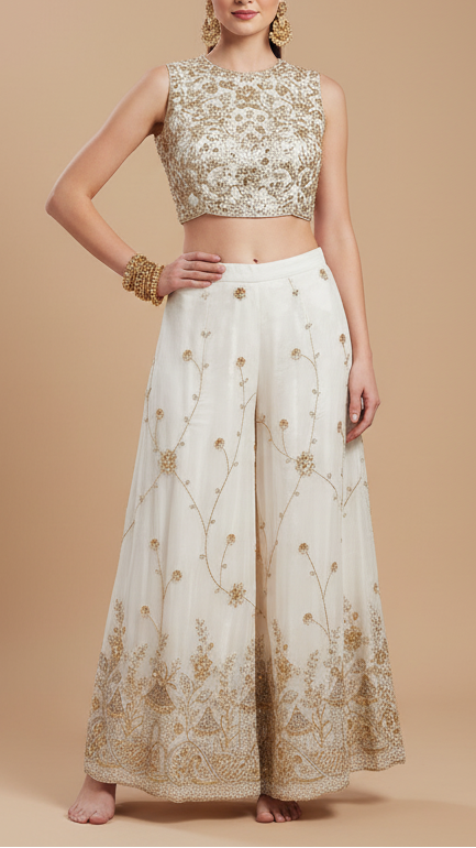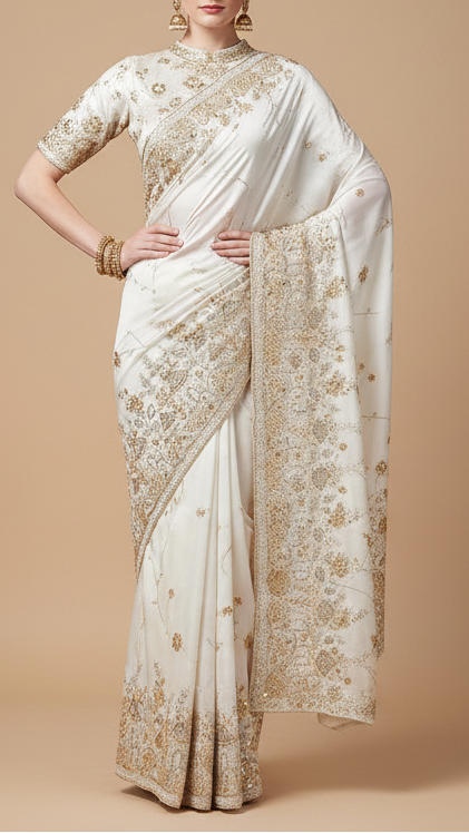 | Fabric Name | White Crepe Fabric With All Over Bead, Zari, Sequins Work And One Side Heavy Border |