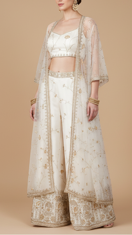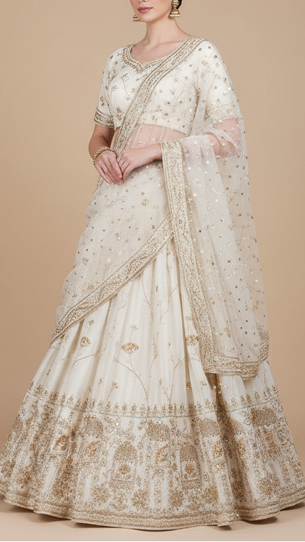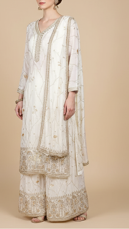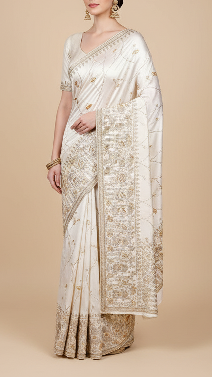 | Fabric Name | White Crepe Fabric With All Over Bead, Zari, Sequins Work And One Side Heavy Border |