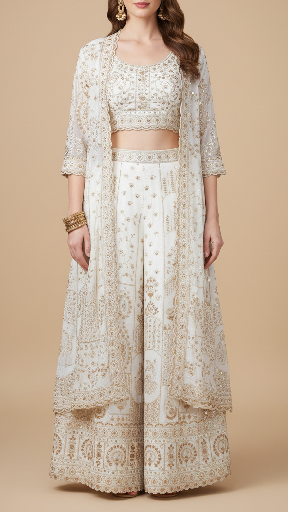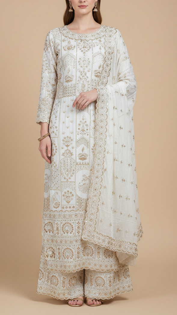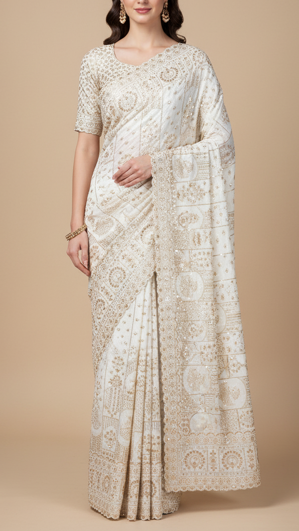| Fabric Name | White Crepe Fabric With All Over Katdana, Bead, Sequins And Zari Work With One Side Border |
