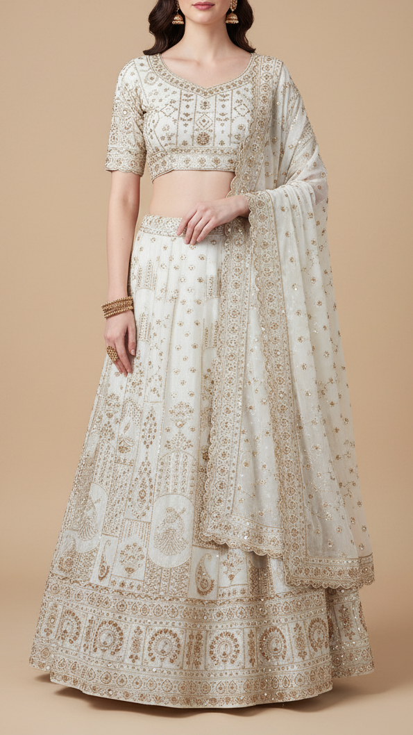 Ideal for sarees, lehengas, gowns, and dupattas, this fabric beautifully complements both modern and traditional outfits. Its ornate detailing with a bordered edge makes it a standout choice for weddings, receptions, and celebratory occasions, ensuring regal and statement-worthy looks.