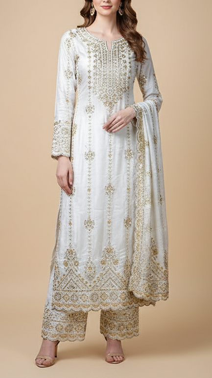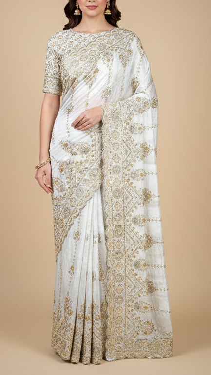 | Fabric Name | White Crepe Fabric With All Over Katdana, Bead, Sequins And Zari Work With One Side Border |