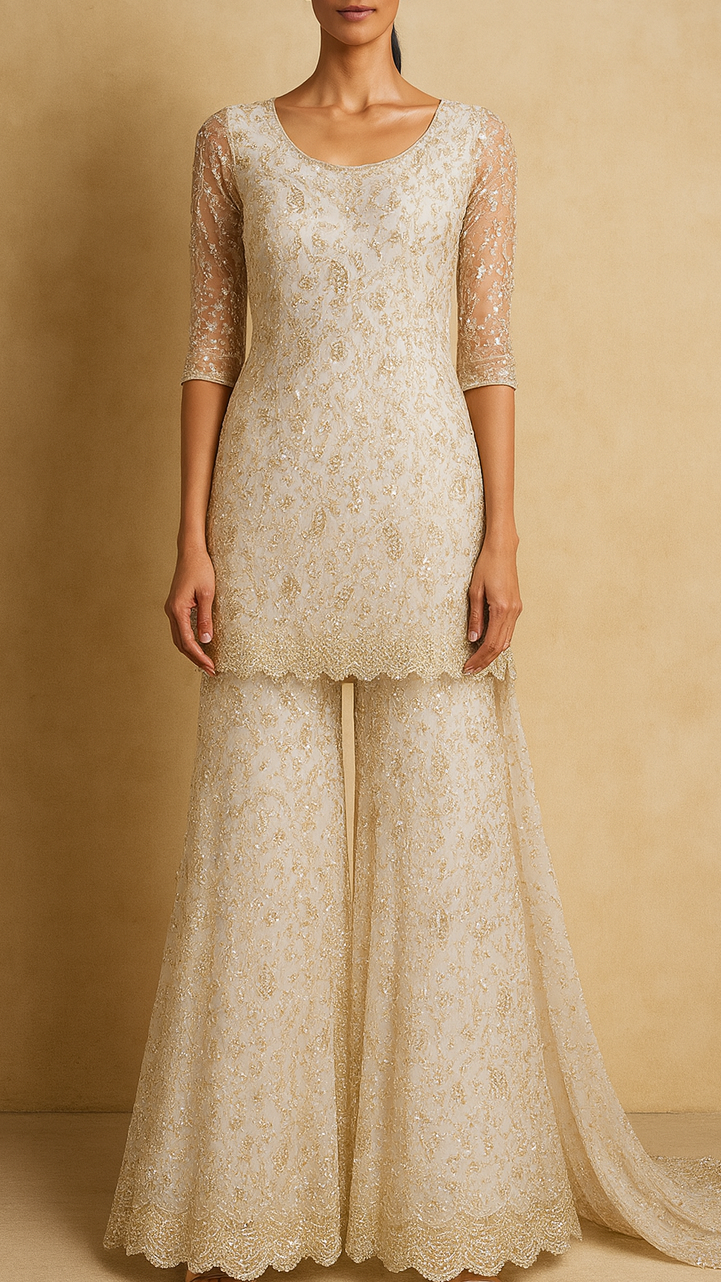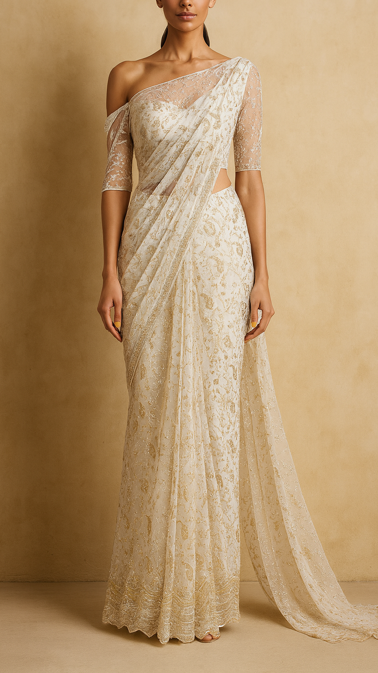 | Fabric Name | White Crepe Fabric With All Over Katdana, Bead, Zari And Sequins Work With One Side Scalloped Border |