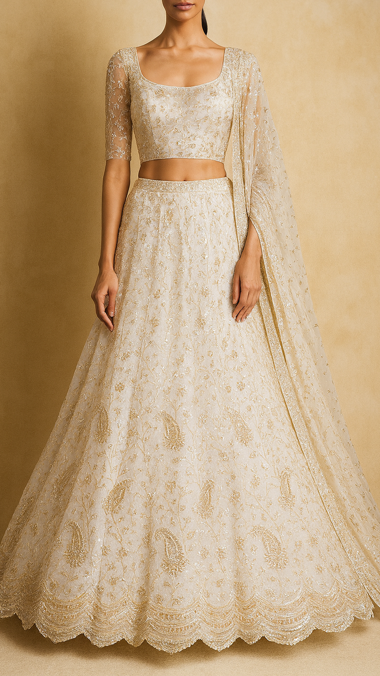 Ideal for sarees, lehengas, gowns, and dupattas, this fabric beautifully combines traditional craftsmanship with modern grace. The combination of detailed embellishments and a scalloped border makes it a stunning choice for weddings, receptions, and festive occasions.