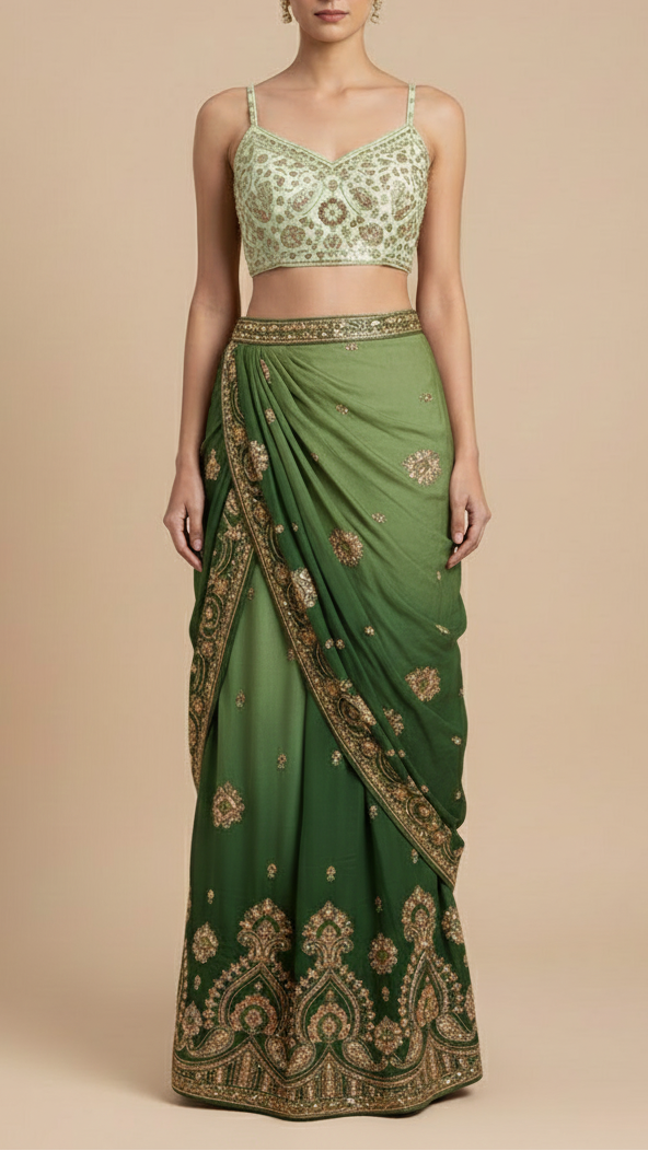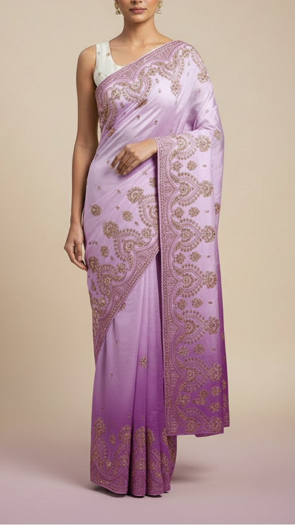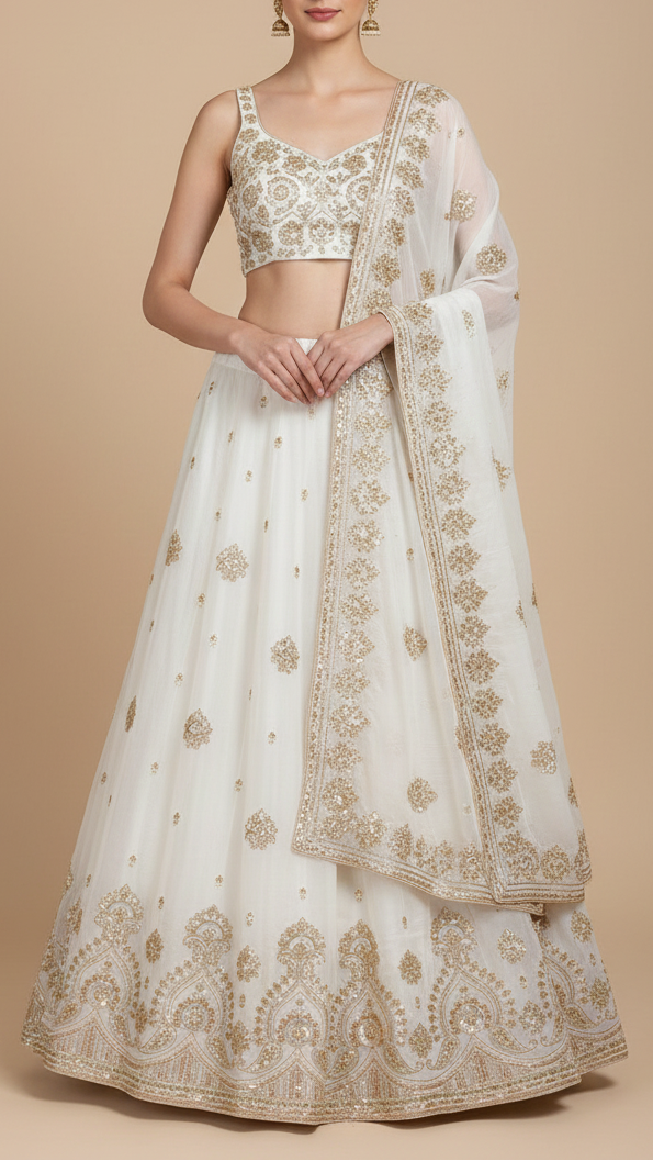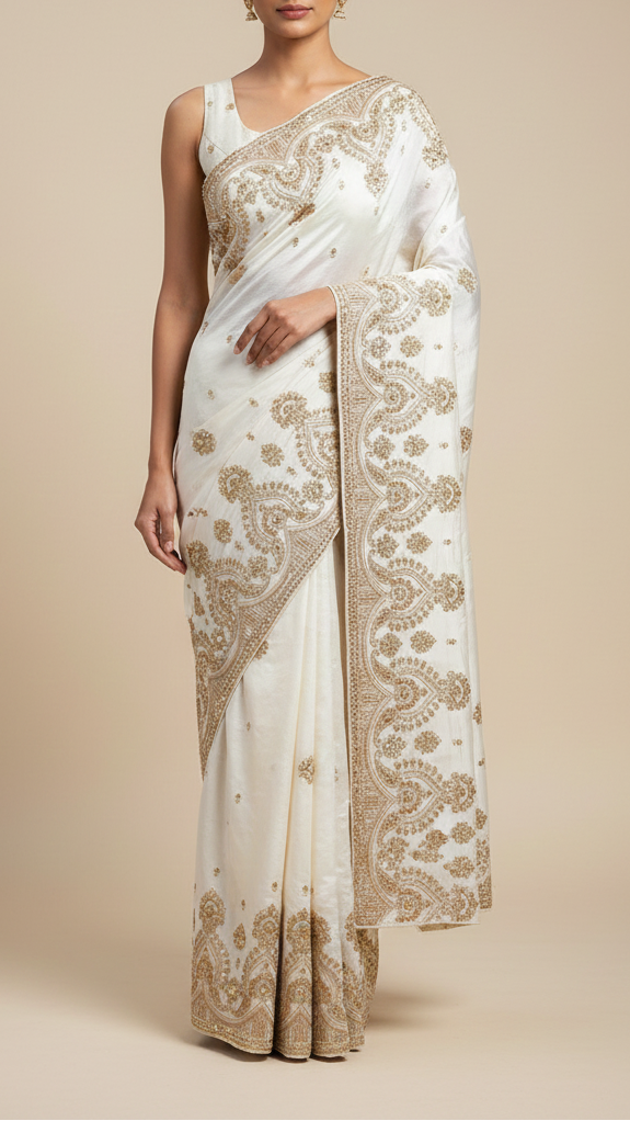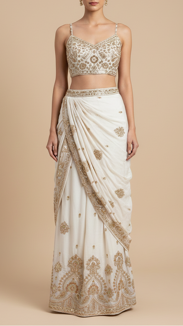 | Fabric Name | White Crepe Fabric With All Over Katdana, Sequins And Zari Work With One Side Border |