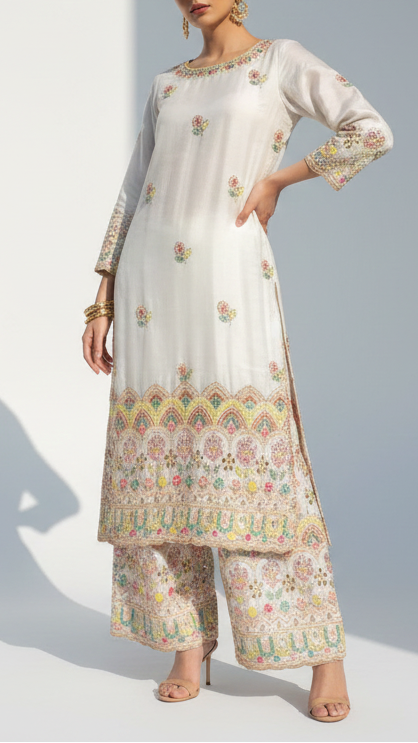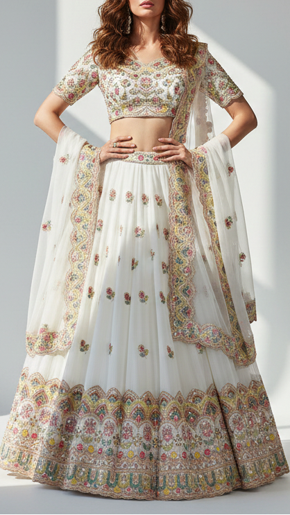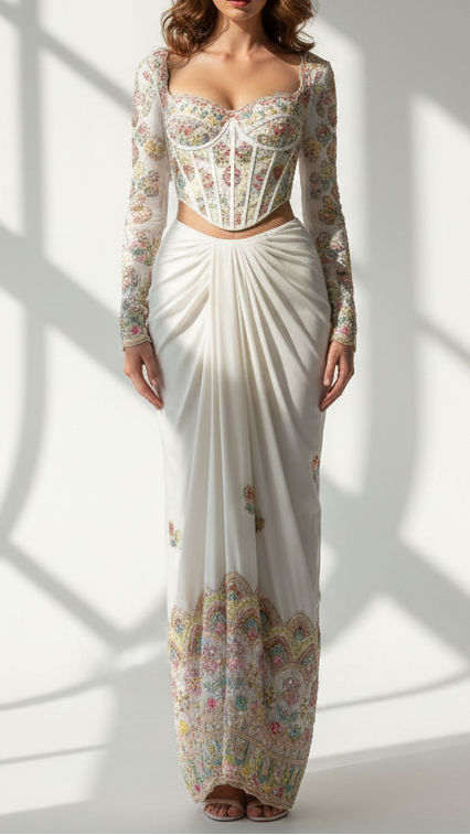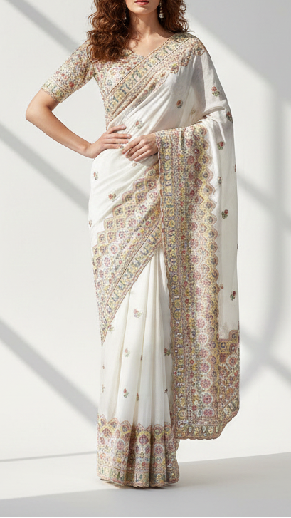 | Fabric Name | White Crepe Fabric With All Over Katdana, Zari, Bead, Thread And Sequins Work With One Side Border |