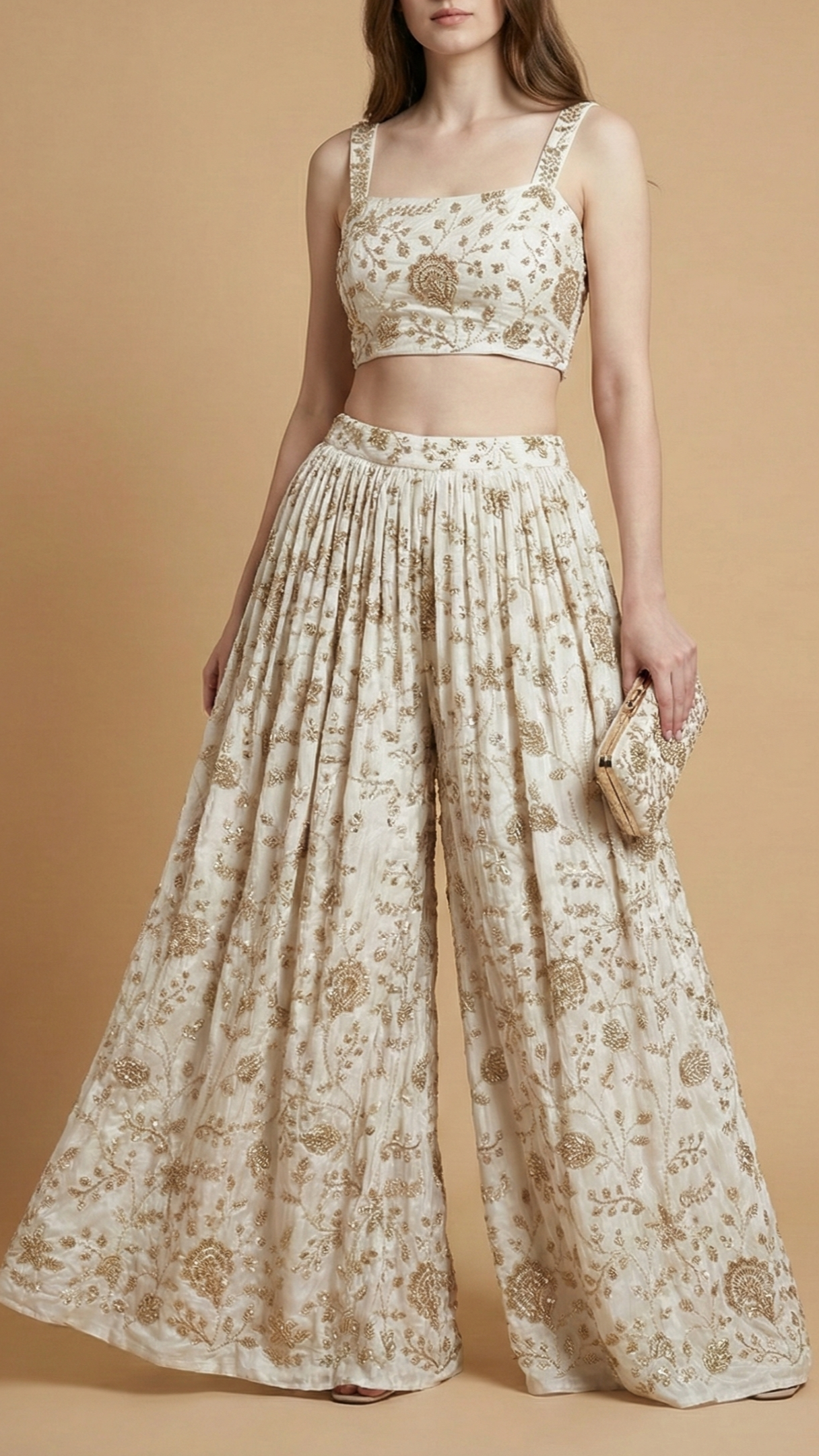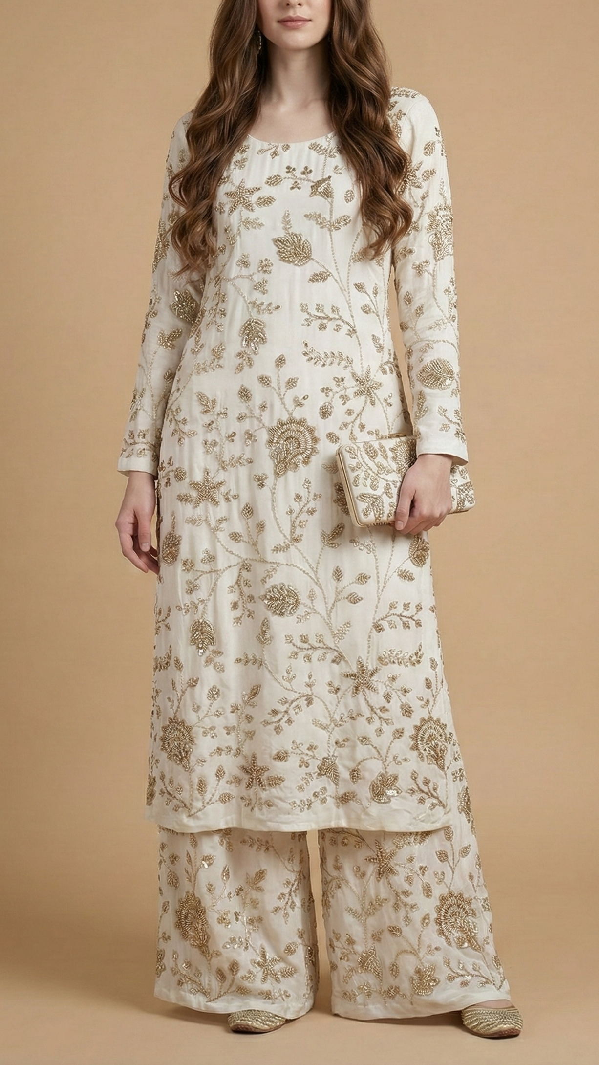 | Fabric Name | White Crepe Fabric With All Over Sequins, Katdana And Bead Work |