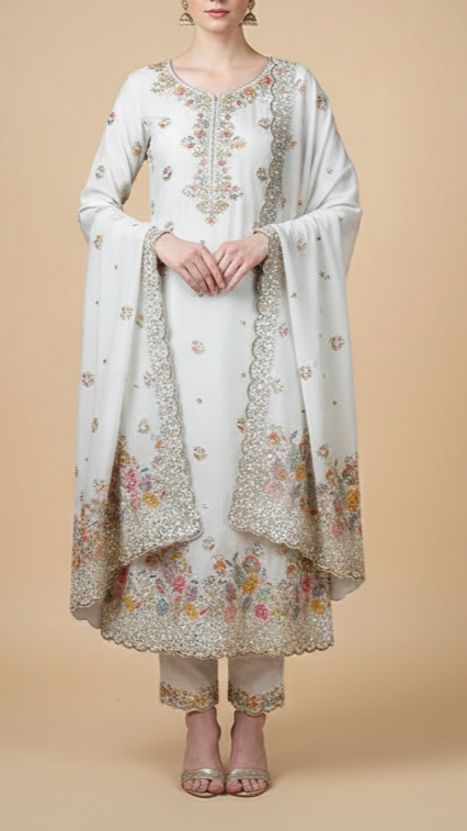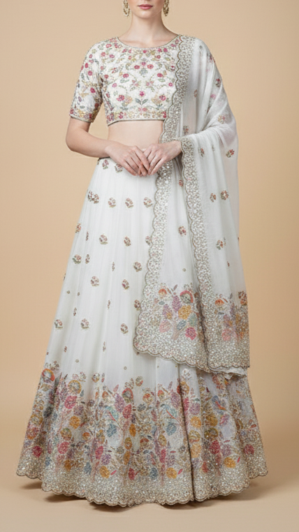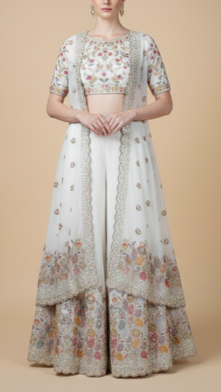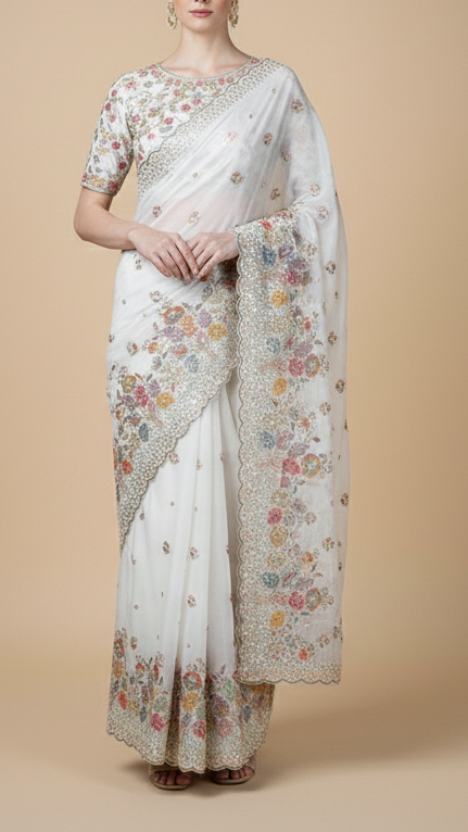 | Fabric Name | White Crepe Fabric With All Over Thread, Bead, Sequins And Zari Work With One Side Border |