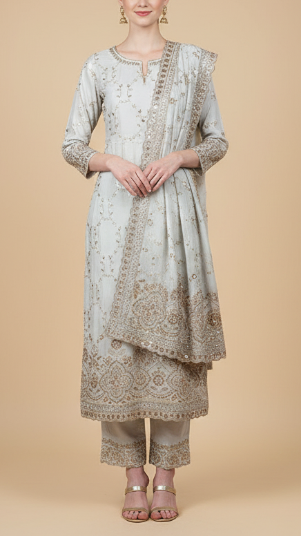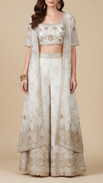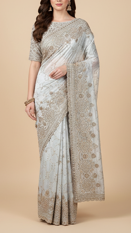 | Fabric Name | White Crepe Fabric With All Over Zari, Sequins, Katdana And Bead Work |
