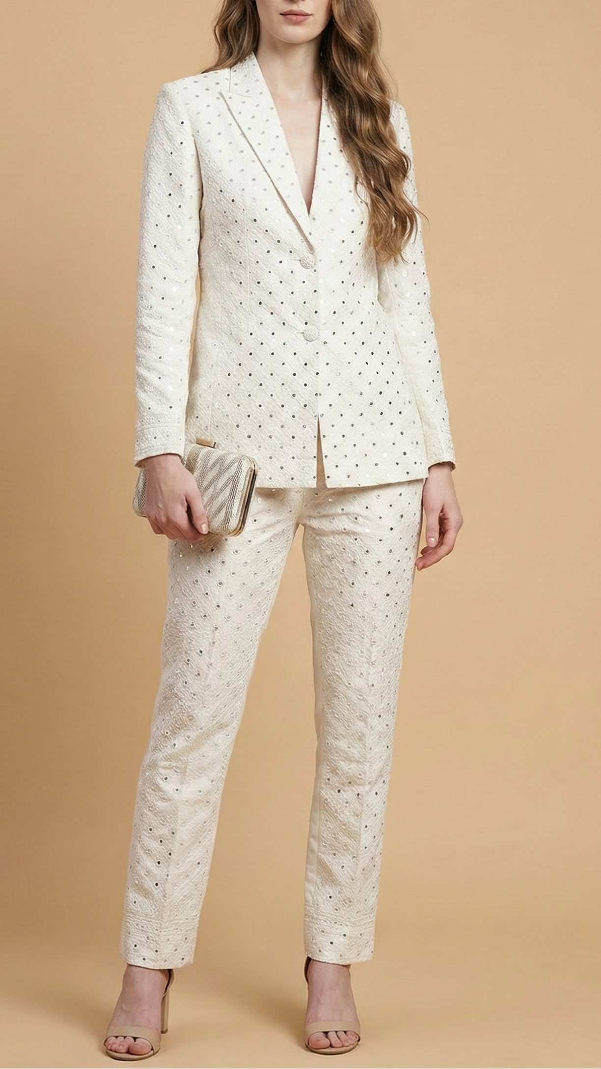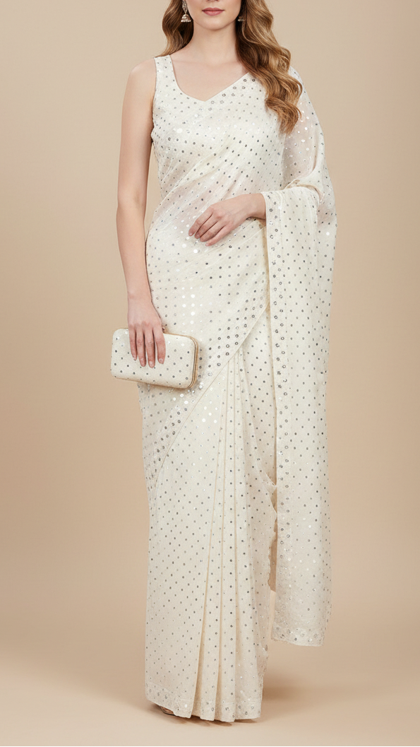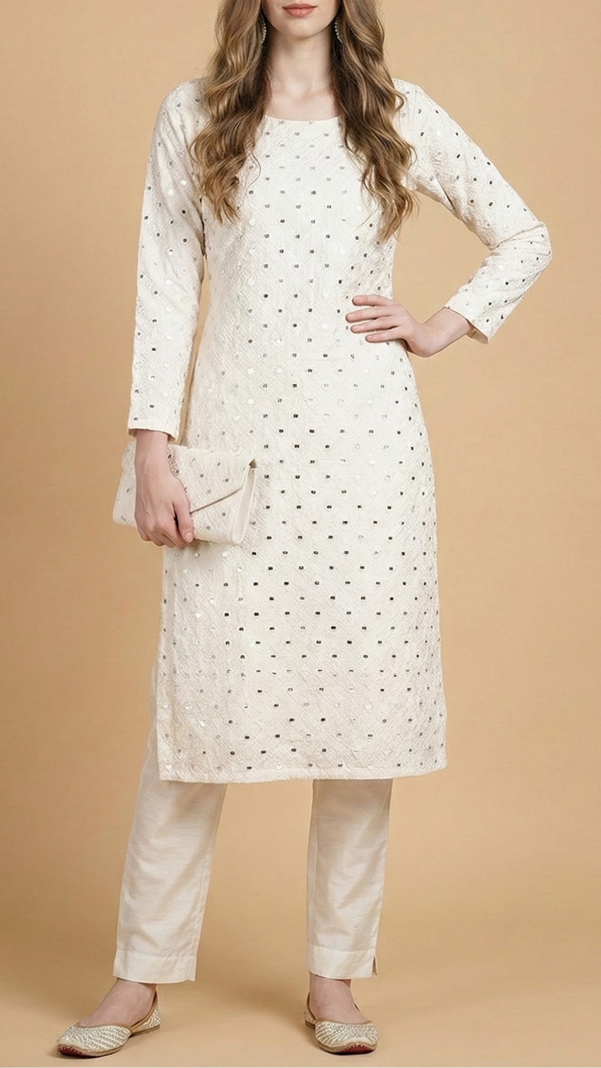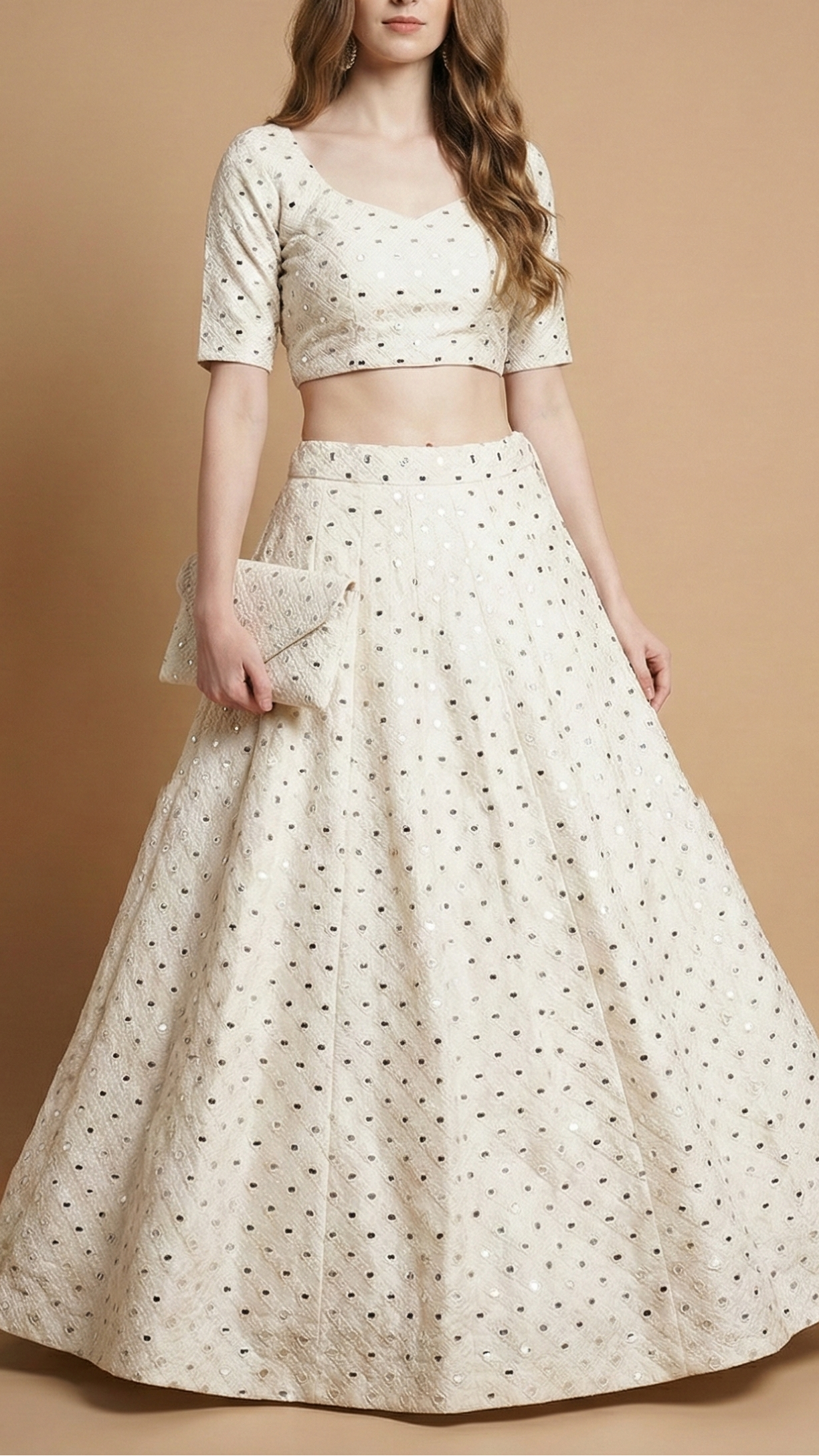 | Fabric Name | White Dola Silk Fabric With All Over Thread And Faux Mirror Work |