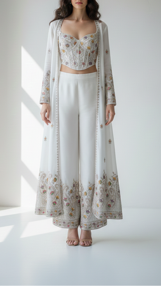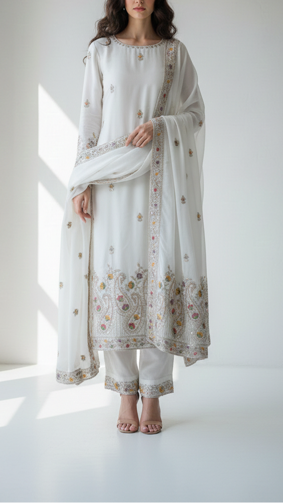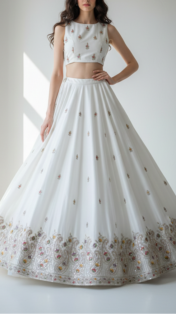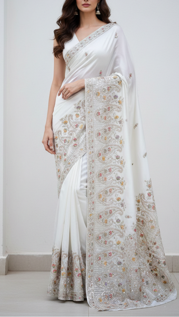 | Fabric Name | White Dyeable Crepe Fabric With All Over Buti Of Zari, Sequins, Thread And Katdana Work With One Side Border |
