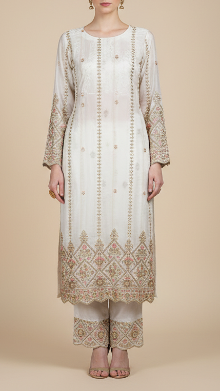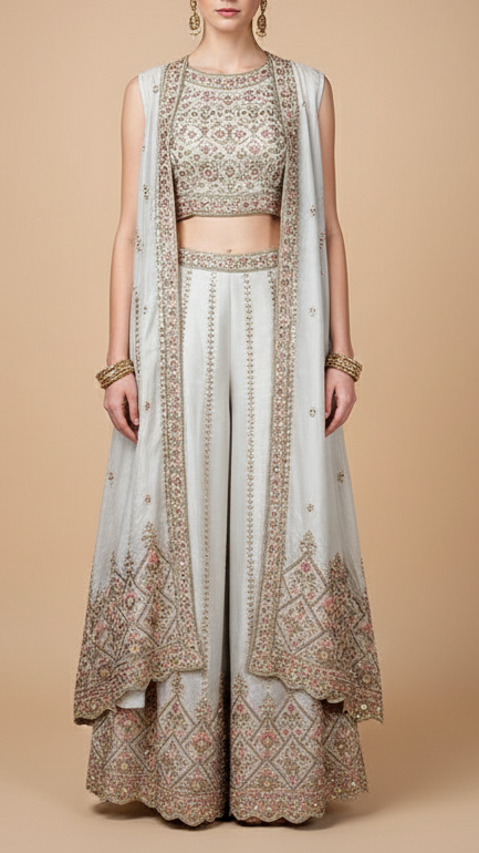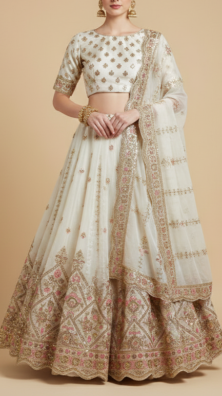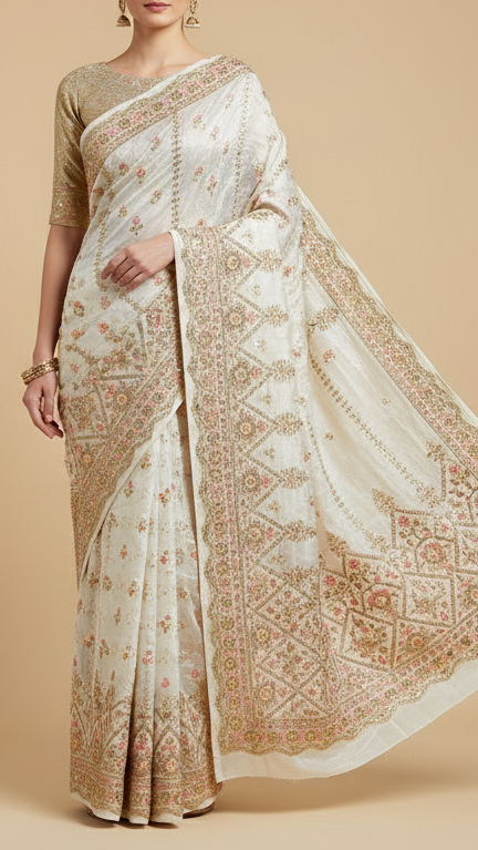 | Fabric Name | White Dyeable Crepe Fabric With All Over Sequins, Katdana And Zari Work With One Side Heavy Border |