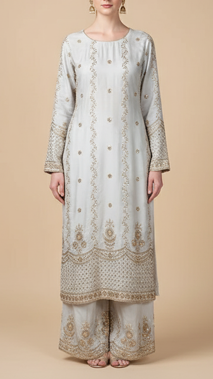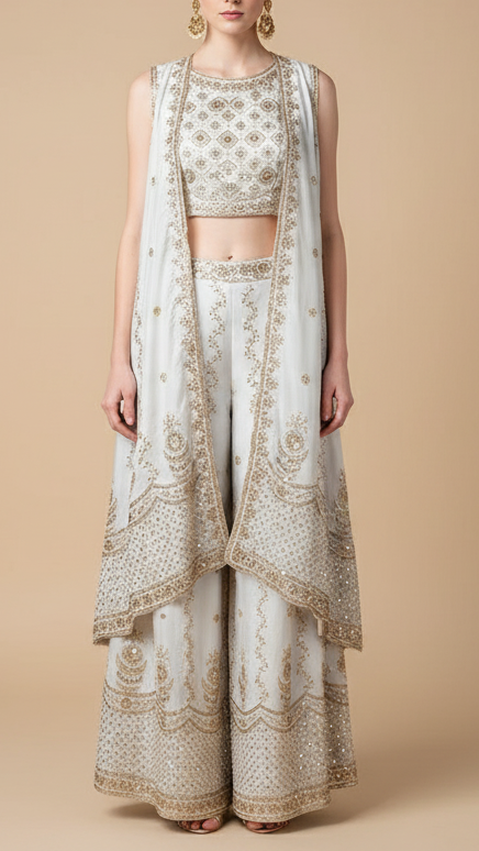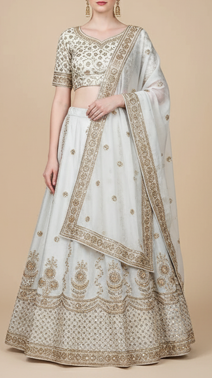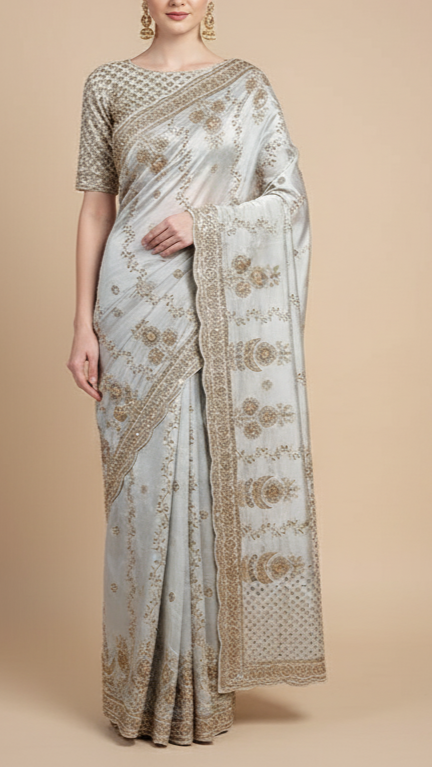 | Fabric Name | White Dyeable Crepe Fabric With All Over Sequins, Katdana And Zari Work With One Side Heavy Border |