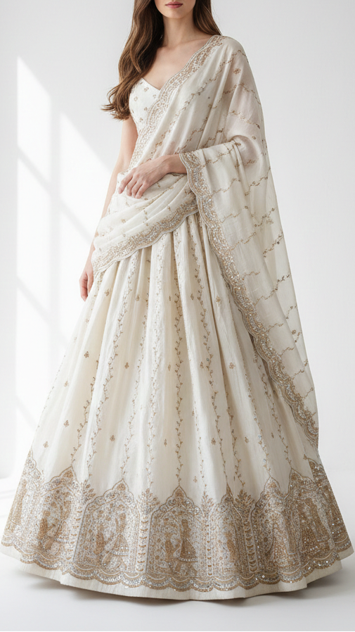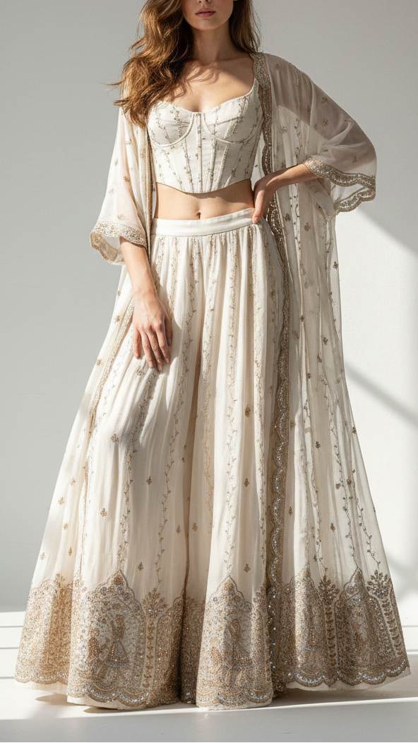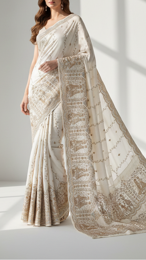 | Fabric Name | White Dyeable Crepe Fabric With All Over Stripes Of Katdana, Bead, Sequins And Zari Work With One Side Heavy Border |